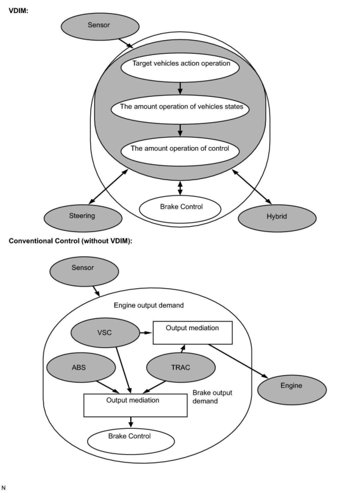 (f) Conventional brake control systems manage all related functions, such as the ABS with EBD, the BA, the TRAC and the VSC independently, according to the vehicle dynamics. In contrast, the VDIM provides smooth control by seamlessly integrating all those functions.