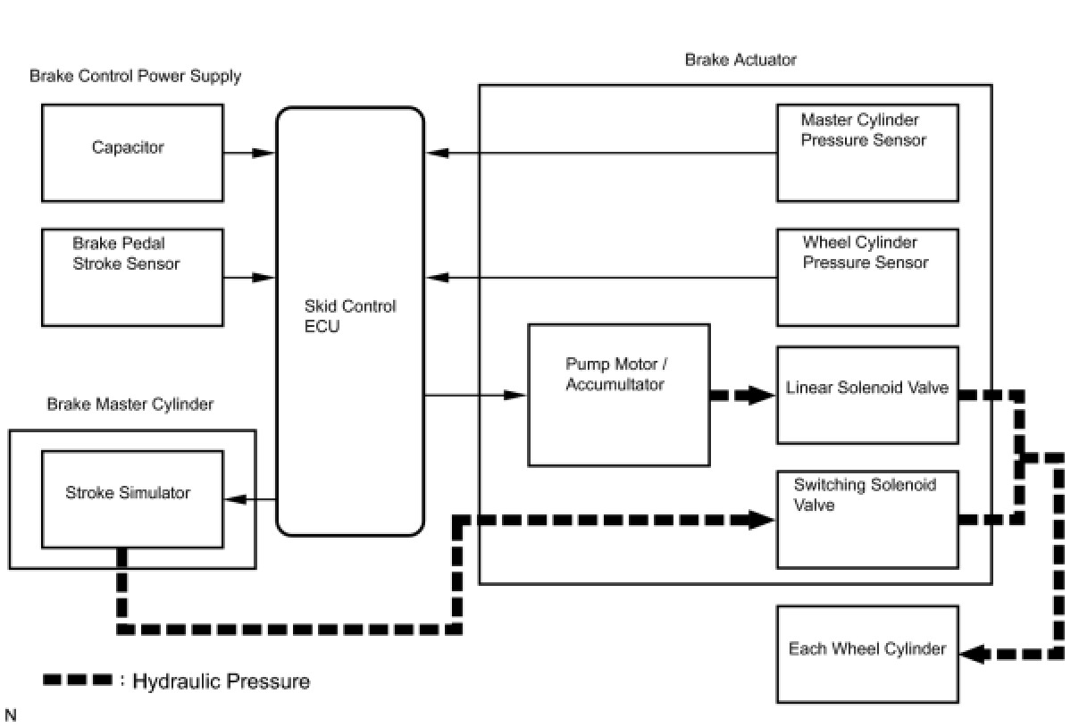 The skid control ECU receives the brake pedal stroke sensor signal and the oil pressure signal from the master cylinder pressure sensor to determine whether brake assist is necessary or not. If brake assist is deemed necessary, the skid control ECU will send control signals to the solenoid. The solenoid valve then controls the pressure applied to each wheel cylinder.