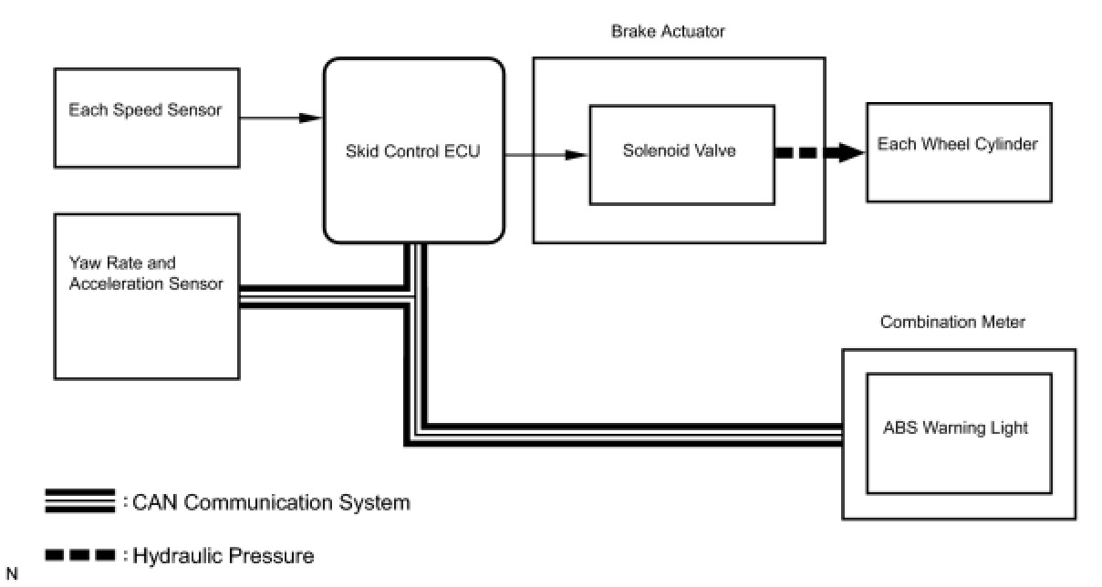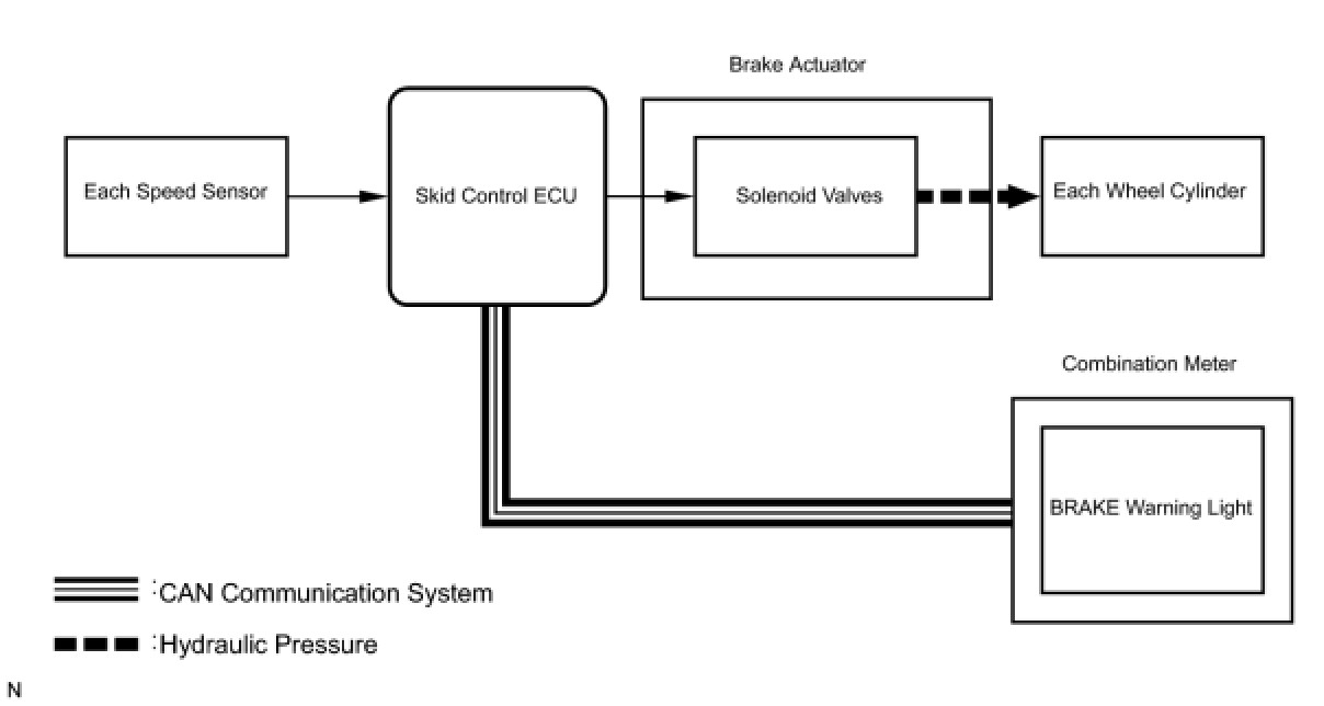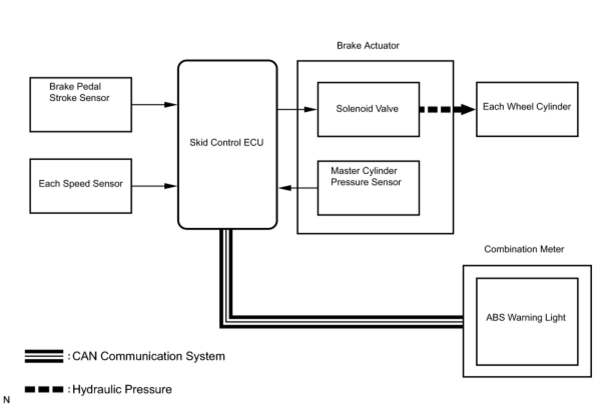 The skid control ECU receives a speed signal from each wheel speed sensor, and uses these signals to detect locking of the wheels. The ECU uses this information in order to determine appropriate control of the solenoid valves.