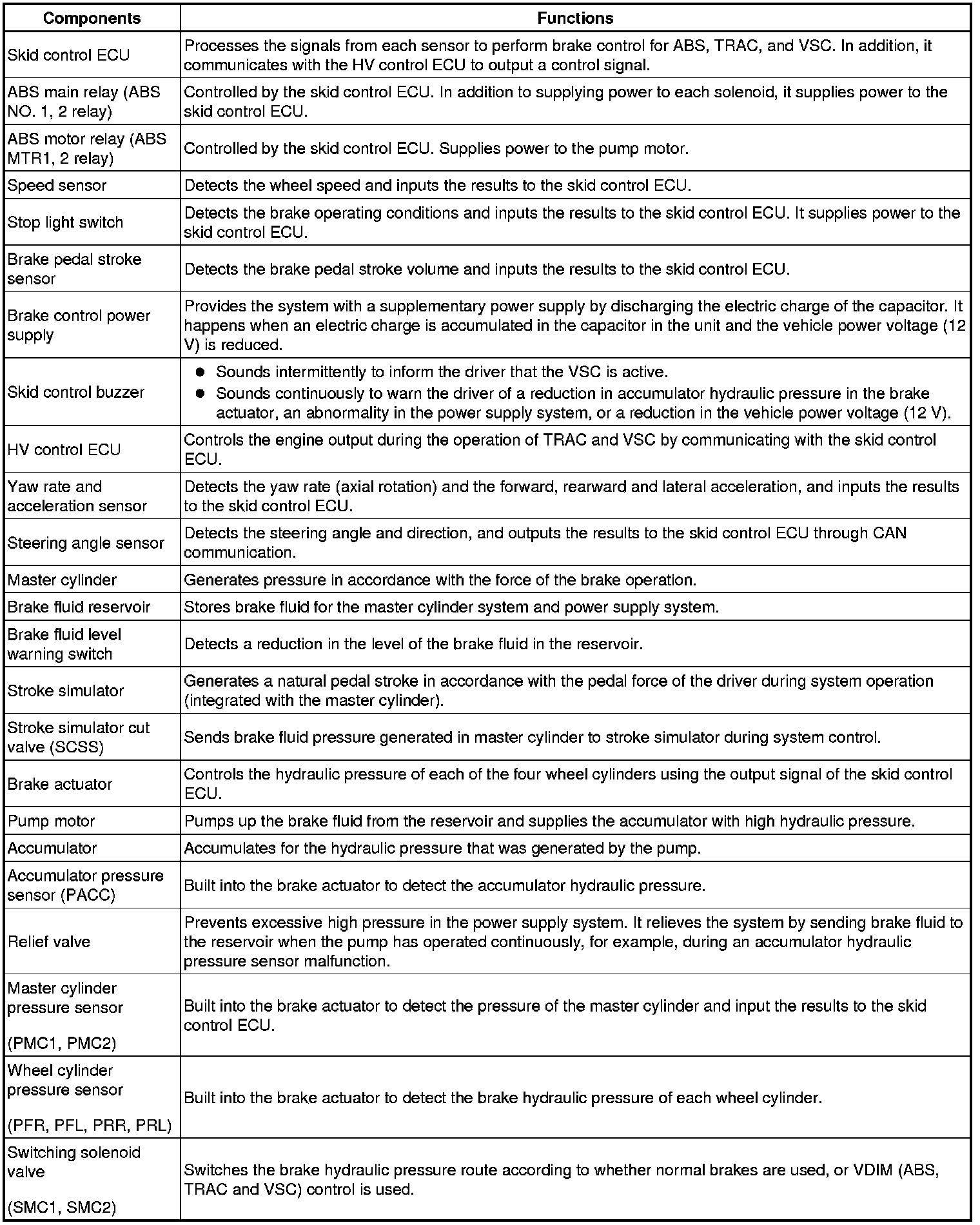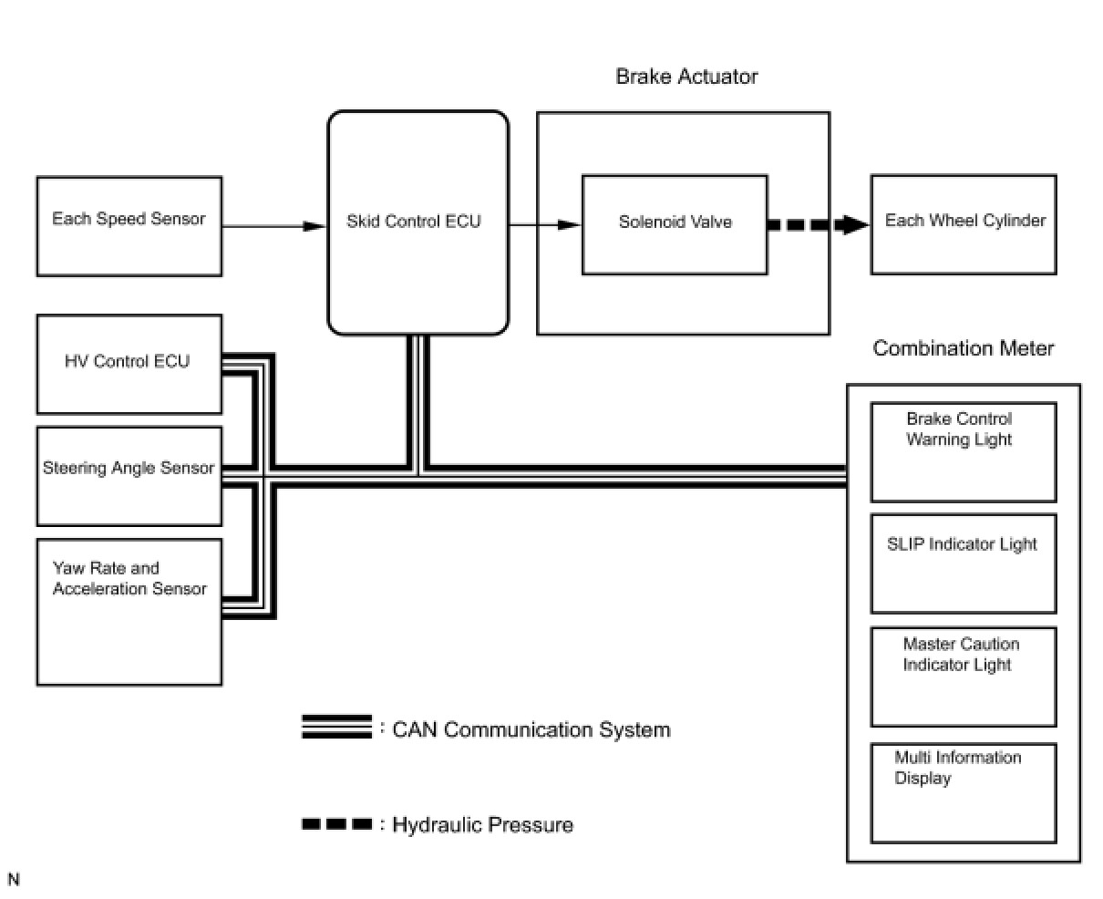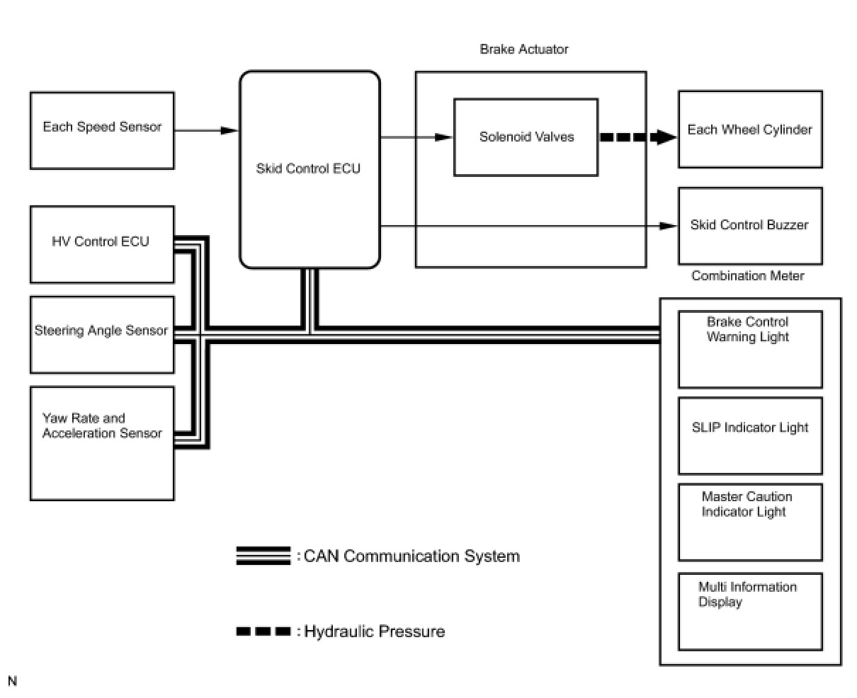 The skid control ECU determines the vehicle operating conditions based on signals received from the wheel speed sensors, yaw rate and acceleration sensor, and steering angle sensor. The skid control ECU sends signals via CAN communication to the HV control ECU in order to control engine torque. The skid control ECU controls brake hydraulic pressure using the solenoid valves.