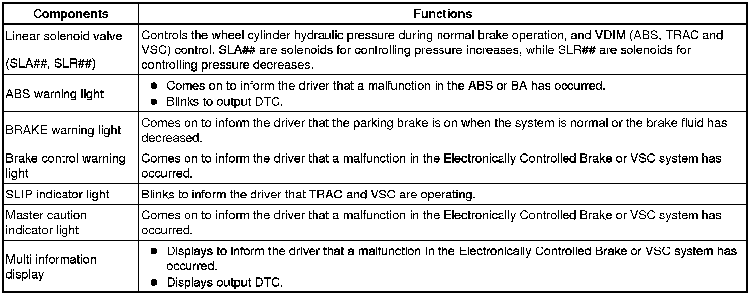 (a) When a failure occurs in the ABS with BA, TRAC and VSC systems, the ABS warning, brake control warning, and SLIP indicator lights come on and the DTC will be displayed on the multi information display and ABS with BA, TRAC and VSC operations will be prohibited. In addition, when there is a failure that disables the EBD operation, the BRAKE warning light also comes on and the EBD operation is prohibited.