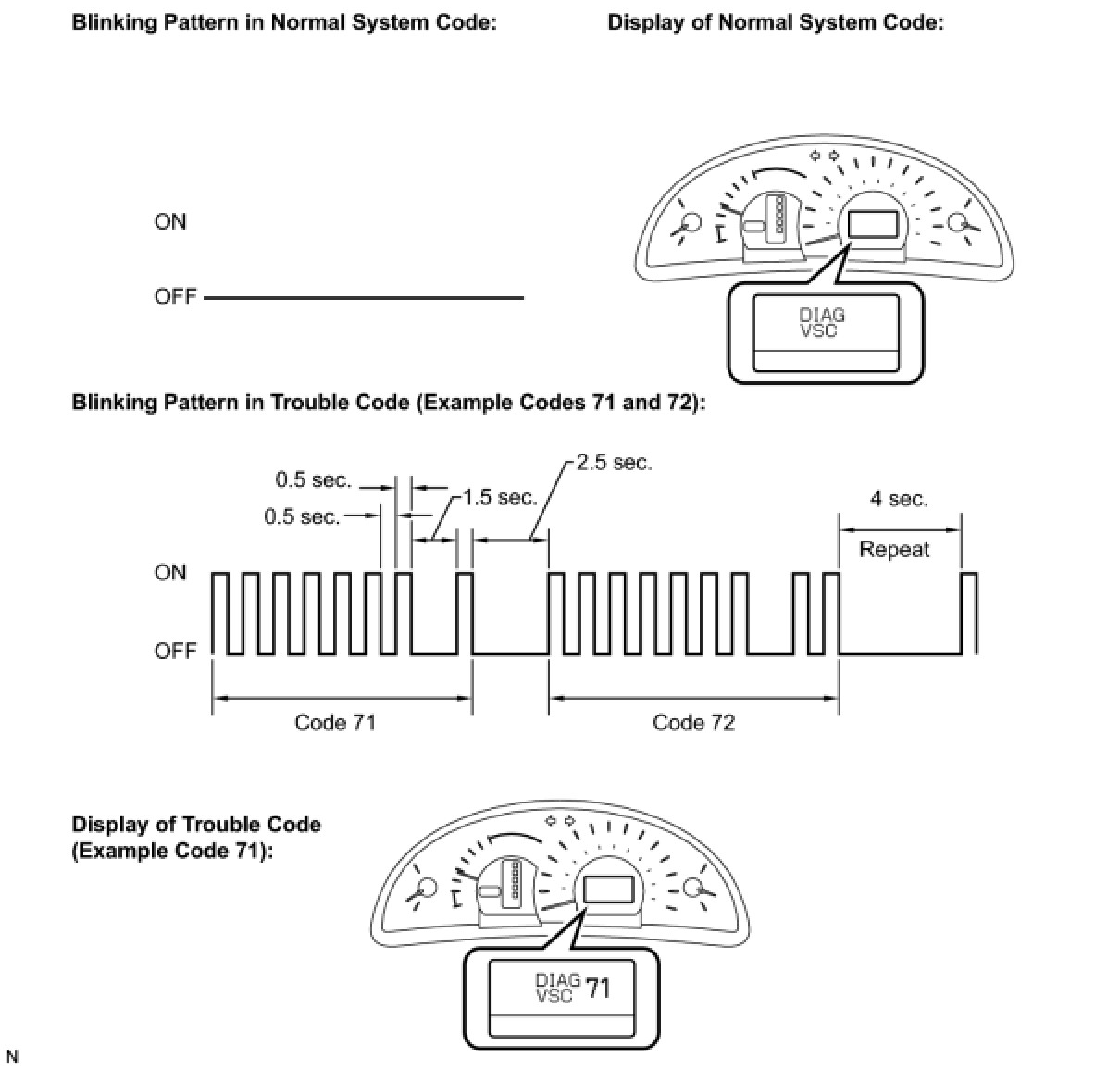 (b) Count the number of blinks of the ABS warning and brake control warning lights and read "DIAG VSC" on the multi information display.