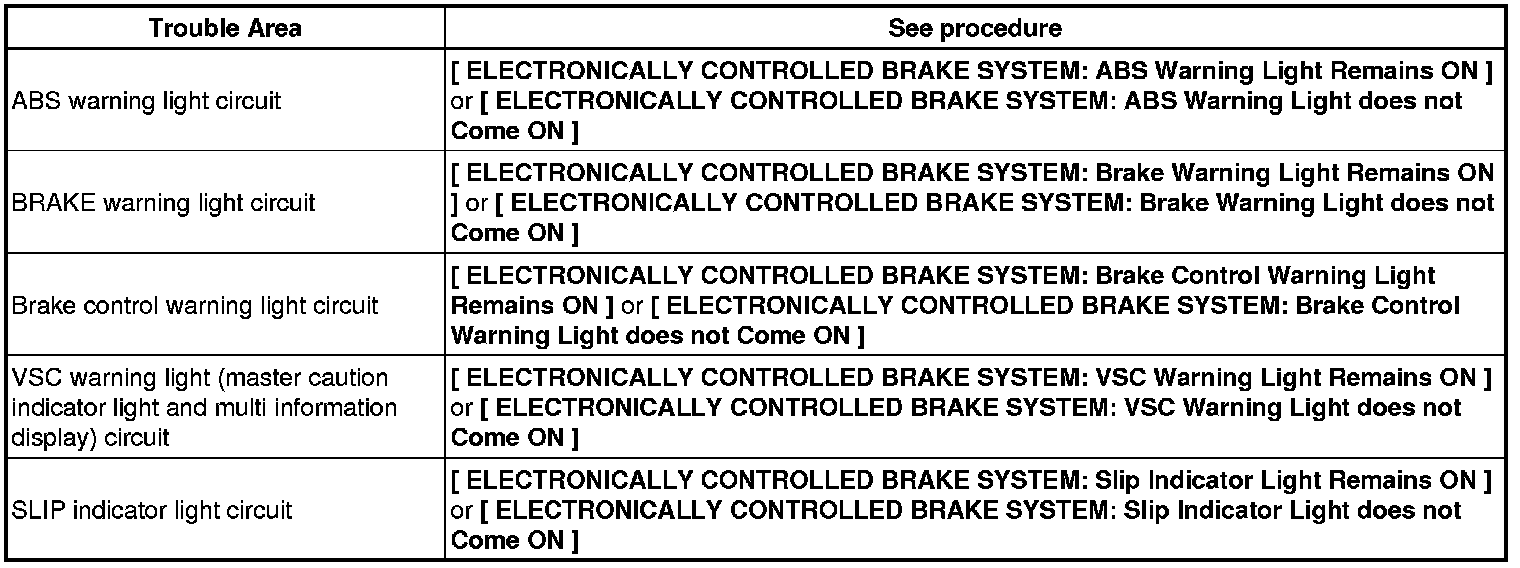 If the ECU stores a DTC, the ABS warning, BRAKE warning, brake control warning, master caution indicator and SLIP indicator lights come on.