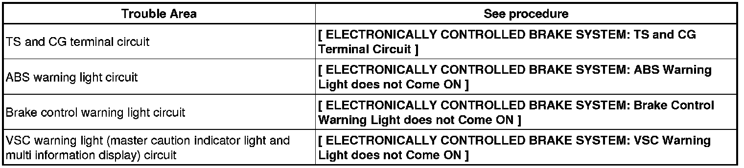- If the ABS warning, brake control warning, and VSC warning (master caution indicator light and multi information display) lights do not blink, inspect the TS and CG terminal circuit, and ABS warning, brake control warning, and VSC warning (master caution indicator light and multi information display) light circuits.