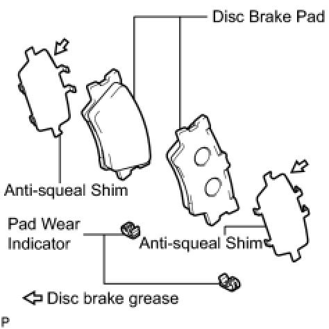 (a) Apply disc brake grease to the inside of the rear anti-squeal shims and install them and the pad wear indicators to each of the 2 rear disc brake pads.