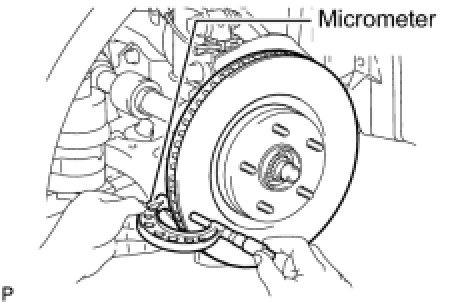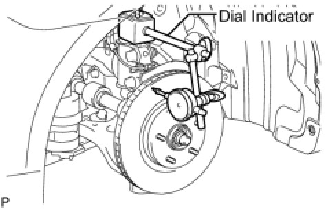 (c) If the runout exceeds the maximum value, change the installation positions of the disc and axle so that the runout will become minimal. If the runout exceeds the maximum even after the installation positions are changed, check the bearing play in the axial direction and the axle hub runout Front Axle Hub. If the bearing play and the axle hub runout are normal and if the disc thickness is not within the specified range, grind the disc. If the disc thickness is less than the minimum, replace the disc.