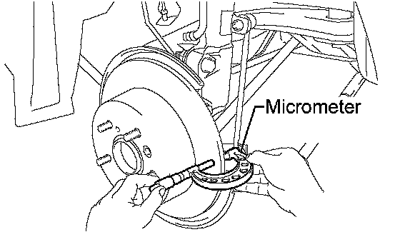 (d) If the runout exceeds the maximum value, change the installation positions of the disc and axle so that the runout will become minimal. If the runout exceeds the maximum even after the installation positions are changed, check the bearing play in the axial direction and the axle hub runout. If the bearing play and the axle hub runout are normal and if the disc thickness is not within the specified range, grind the disc. If the disc thickness is less than the minimum, replace the disc.