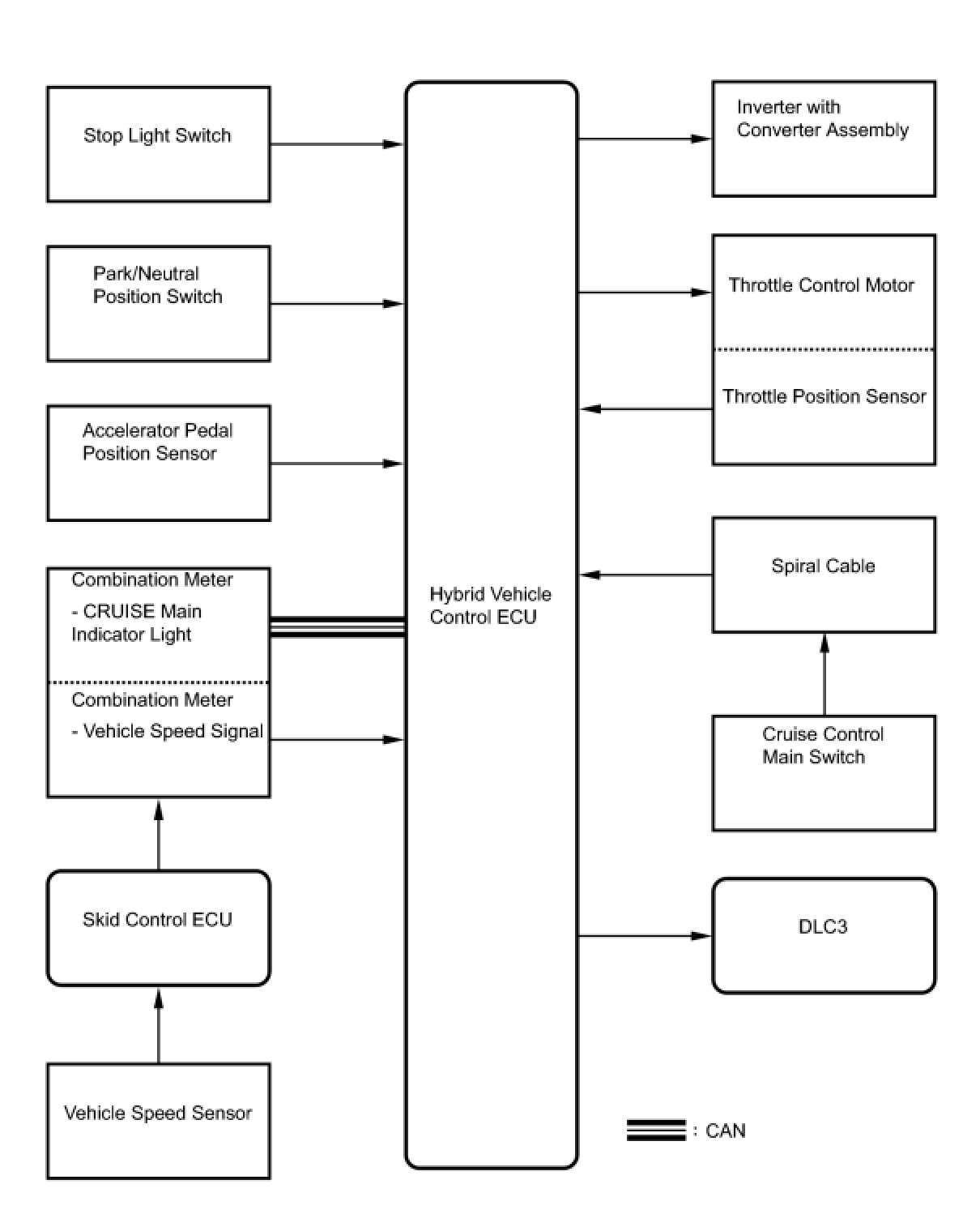 - The hybrid vehicle control ECU receives a park/neutral position switch signal and cancels the cruise control system when the shift lever is moved from the D to the N or B position.