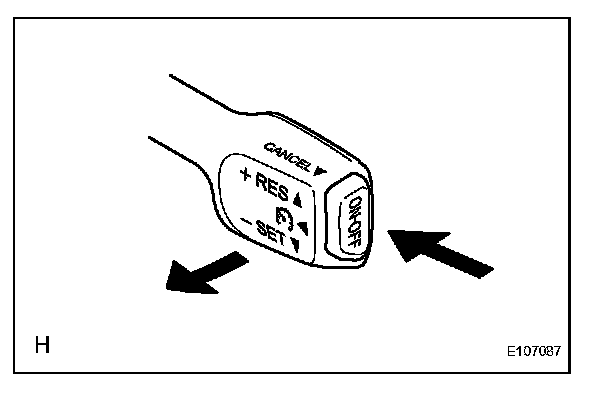 4. Check that vehicle speed increases while the cruise control main switch is pushed to +(ACCEL)/RES (RESUME), and that the vehicle cruises at the newly set speed when the switch is released.
