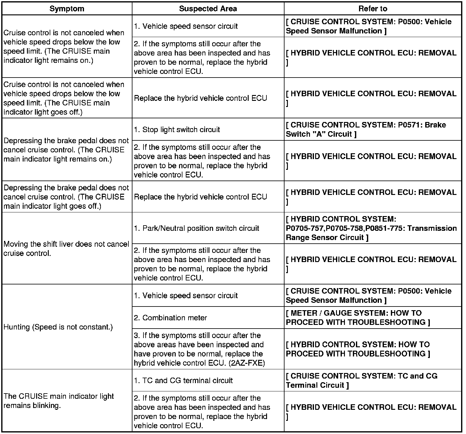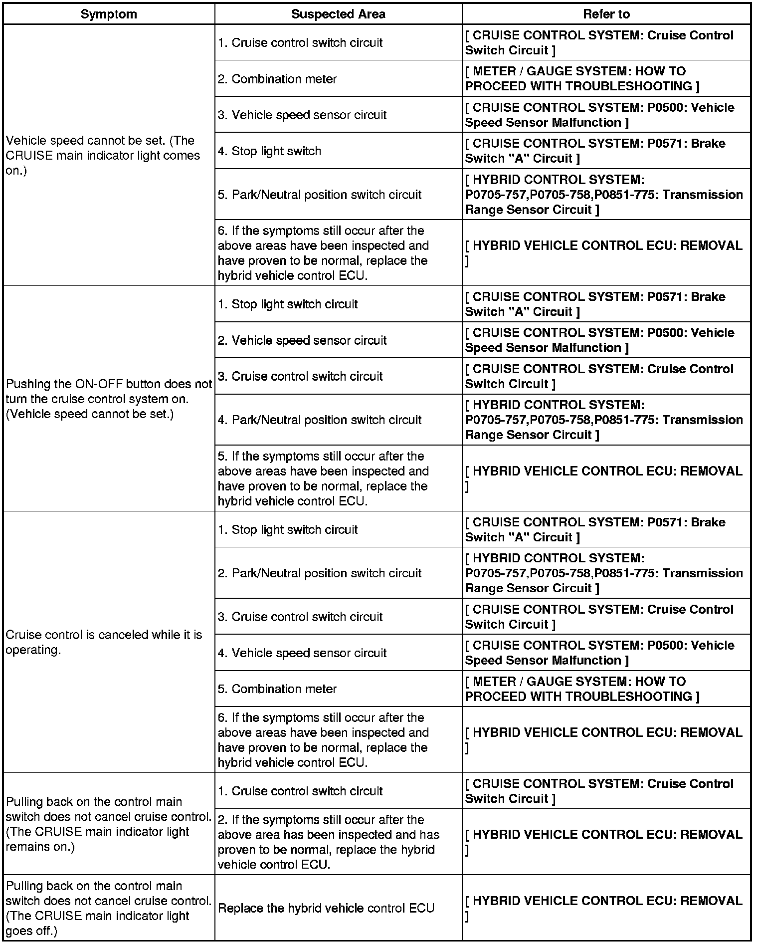 CRUISE CONTROL: CRUISE CONTROL SYSTEM: PROBLEM SYMPTOMS TABLE