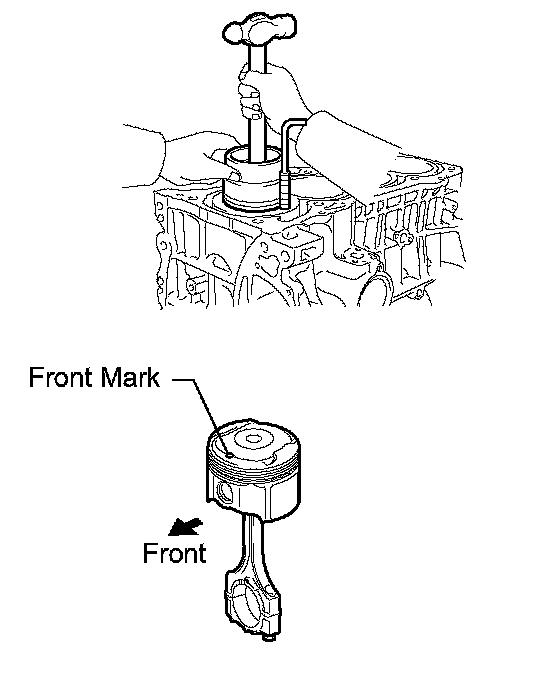 (c) Using a piston ring compressor, push the correctly numbered piston and connecting rod assemblies into each cylinder with the front mark of the piston facing forward.