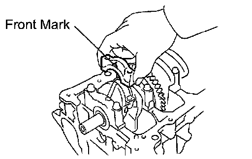 (c) Examine the front marks and install the bearing caps on the cylinder block.
