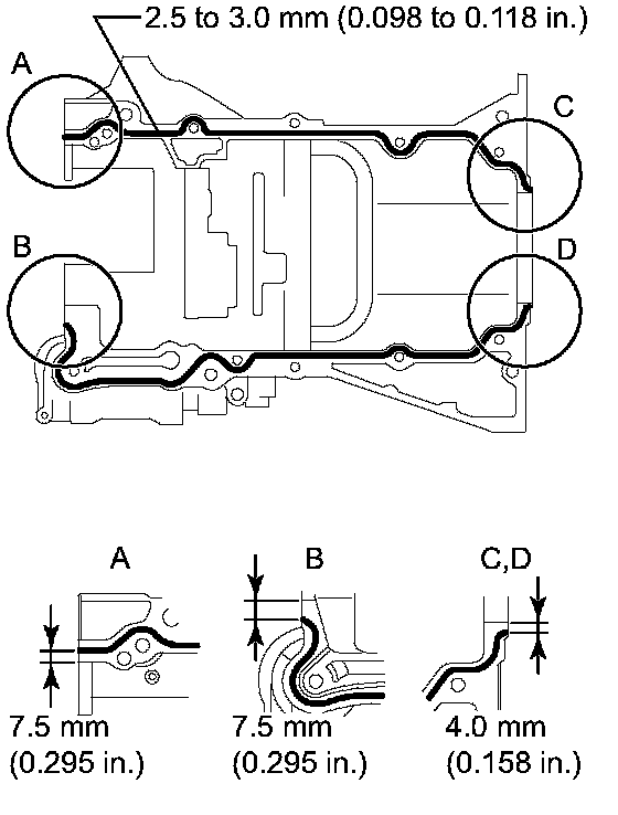 (d) Apply seal packing in a continuous bead (diameter: 2.5 to 3.0 mm (0.098 to 0.118 inch)) to the places shown in the illustration.