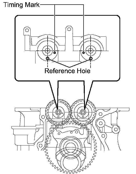 (e) Install the stiffening crankcase so that the reference holes on the balance shafts are positioned as shown in the illustration.