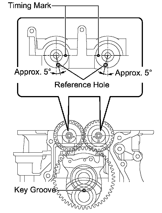 (i) Turn the crankshaft again to set the key groove to the bottom. Make sure that the timing marks are aligned as shown in the illustration.