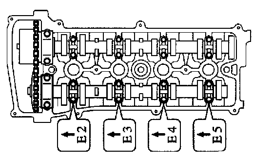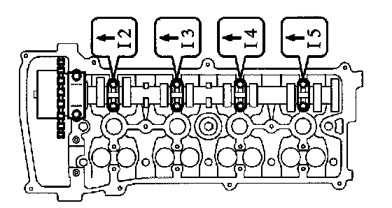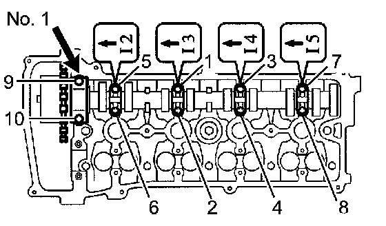 (b) Examine the front marks and numbers, and check that the order is as shown in the illustration. Then install the bearing caps onto the cylinder head.