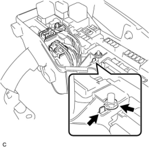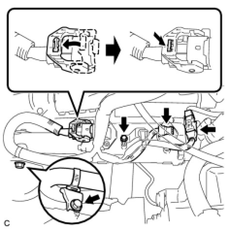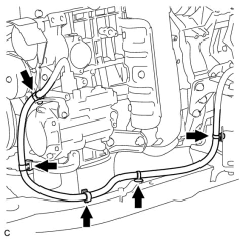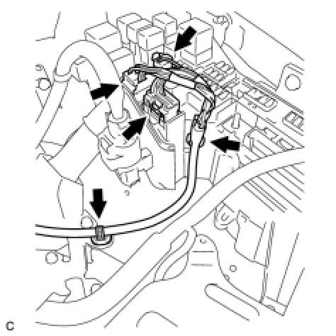 (e) Connect the 3 connectors and 2 clamps to the engine room junction block.
