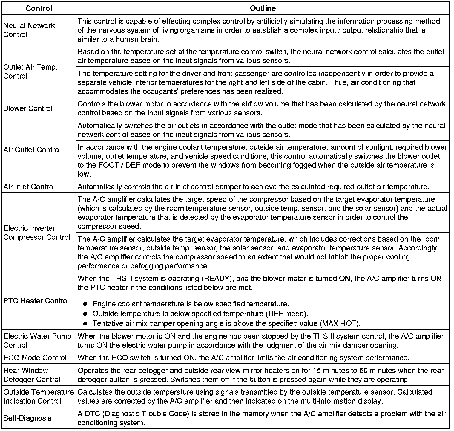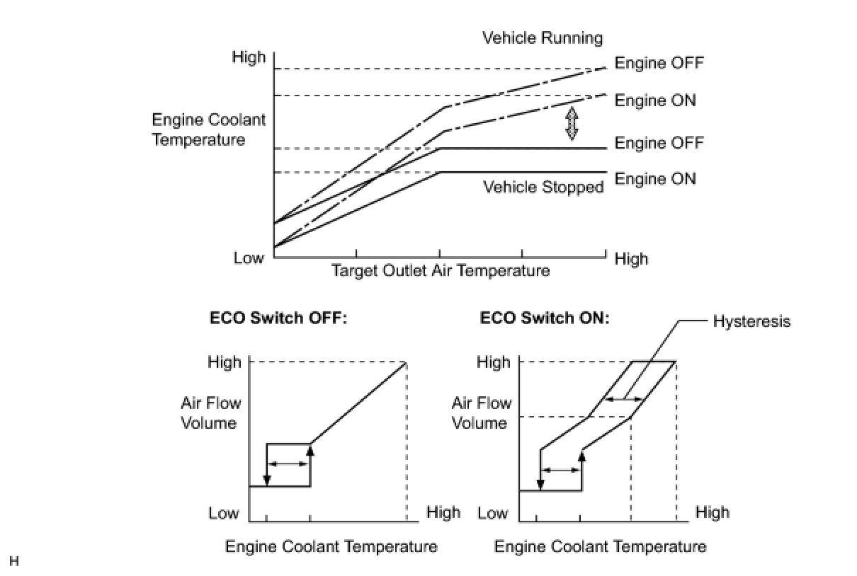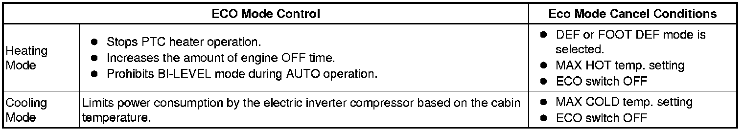 (1) Eco mode control limits the air conditioning system performance during heating and cooling and increases the amount of engine OFF time, thus improving the fuel economy.