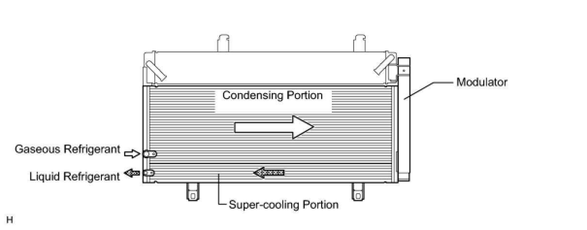 (a) A MF (Multi-Flow) type condenser is used. The condenser consists of two cooling portions: a condensing portion and a super-cooling portion, and gas-liquid separator (modulator) are integrated together. This condenser uses a sub-cool cycle that offers excellent heat-exchange performance.