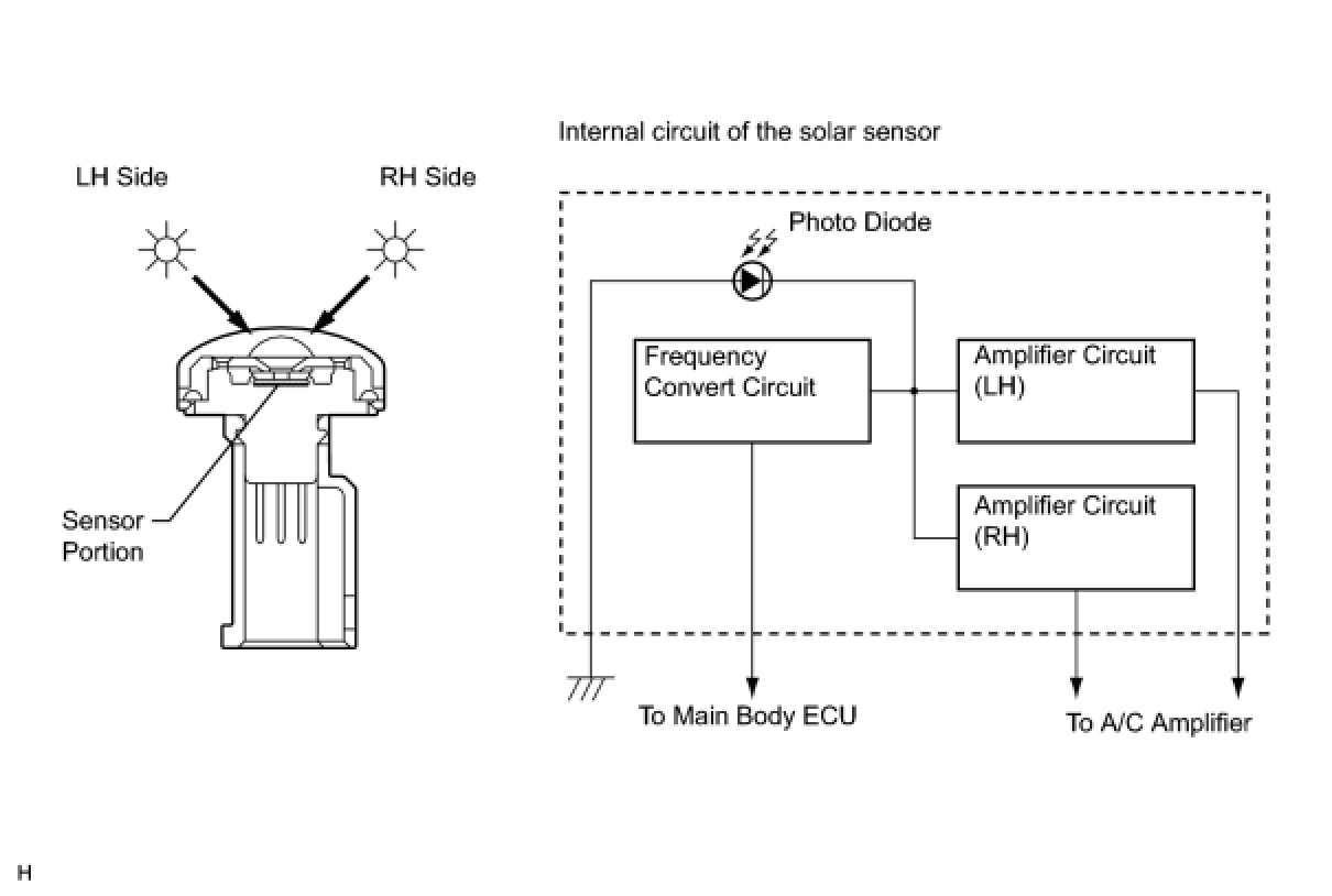 (b) A solar sensor detects (in the form of changes in the current that flows through the built-in photo diode) the changes in the amount of sunlight from the LH and RH sides (2 directions) and outputs these sunlight strength signals to the A/C amplifier.
