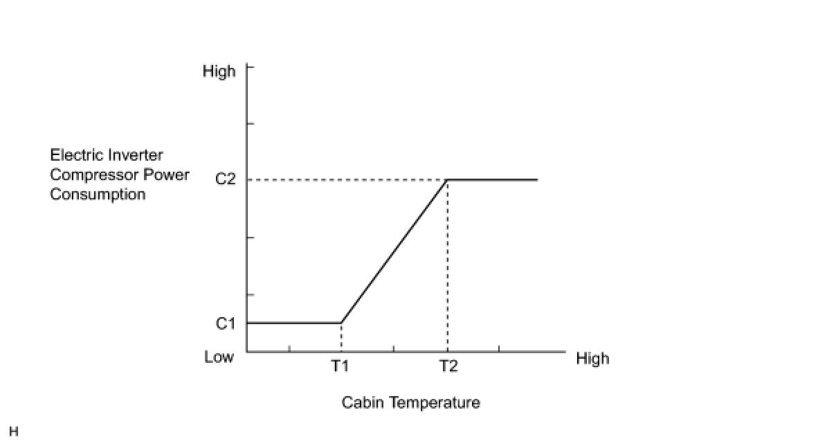 (2) The A/C amplifier does not limit the power consumption very much (C2 shown in the graph below), and prioritizes decreasing the cabin temperature when the cabin temperature is high (T2 or above). When the cabin temperature decreases to T1 or below, the A/C amplifier limits the power consumption of the electric inverter compressor C1 and restrains the cooling performance. This prevents the SOC (state of charge) of the HV battery from decreasing and increases the amount of engine OFF time, improving the fuel economy.