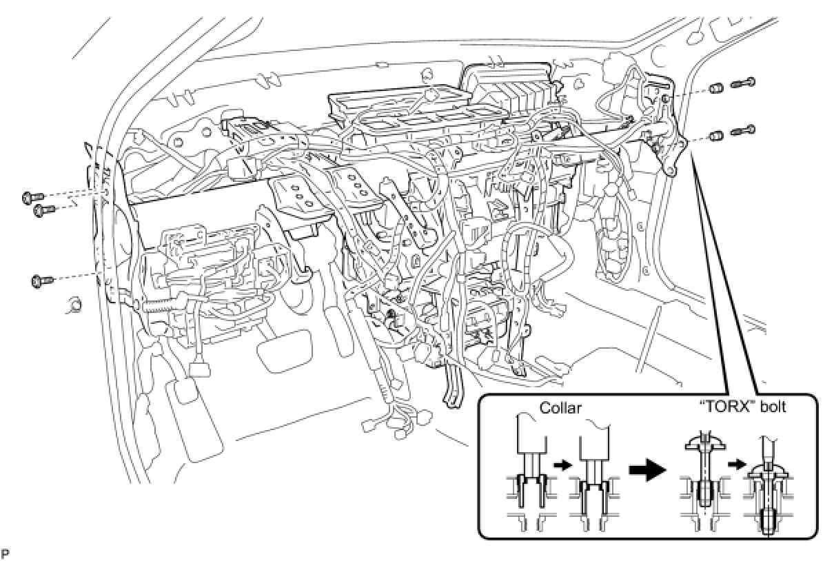 (2) Using a "TORX" socket wrench (T40), install the instrument panel reinforcement assembly with the 2 "TORX" bolts.