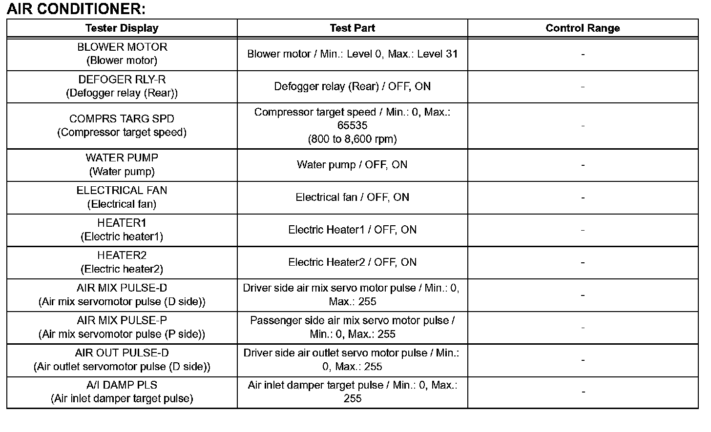 e. Perform the ACTIVE TEST by referring to the table.