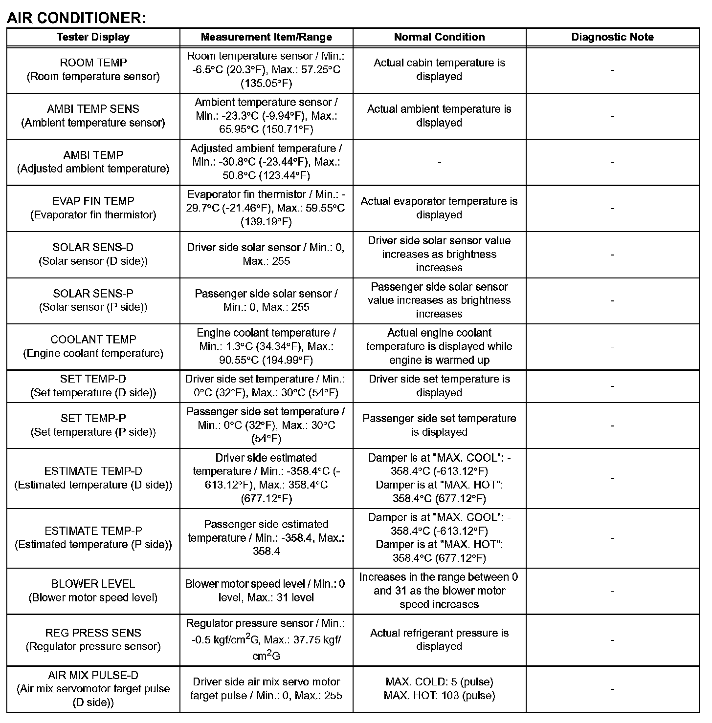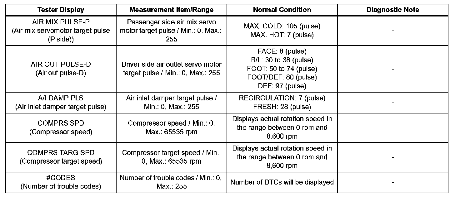 d. Enter the following menus: DIAGNOSIS / OBD/ MOBD / AIR CONDITIONER / DATA LIST.