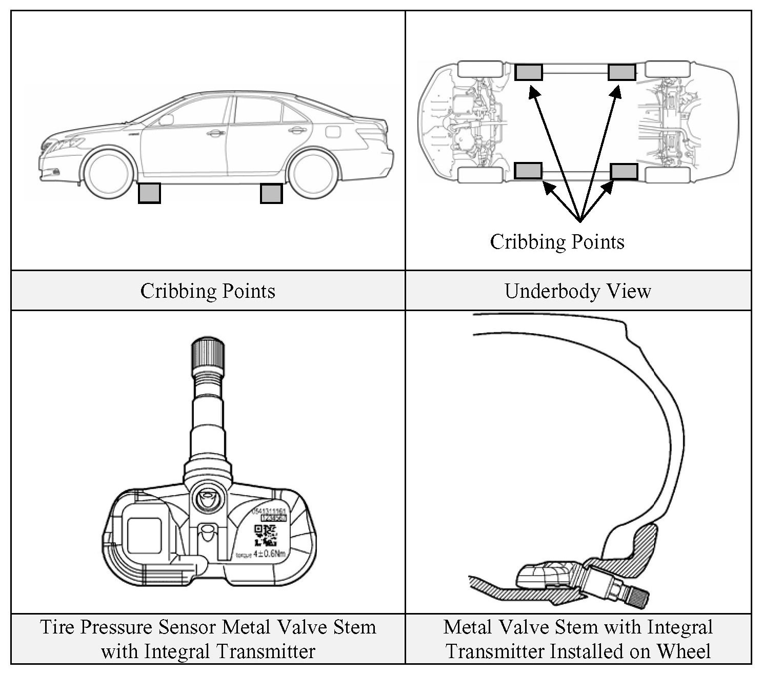 Crib at (4) points directly under the front and rear pillars. Do not place cribbing under the high voltage power cables, exhaust system, or fuel system.