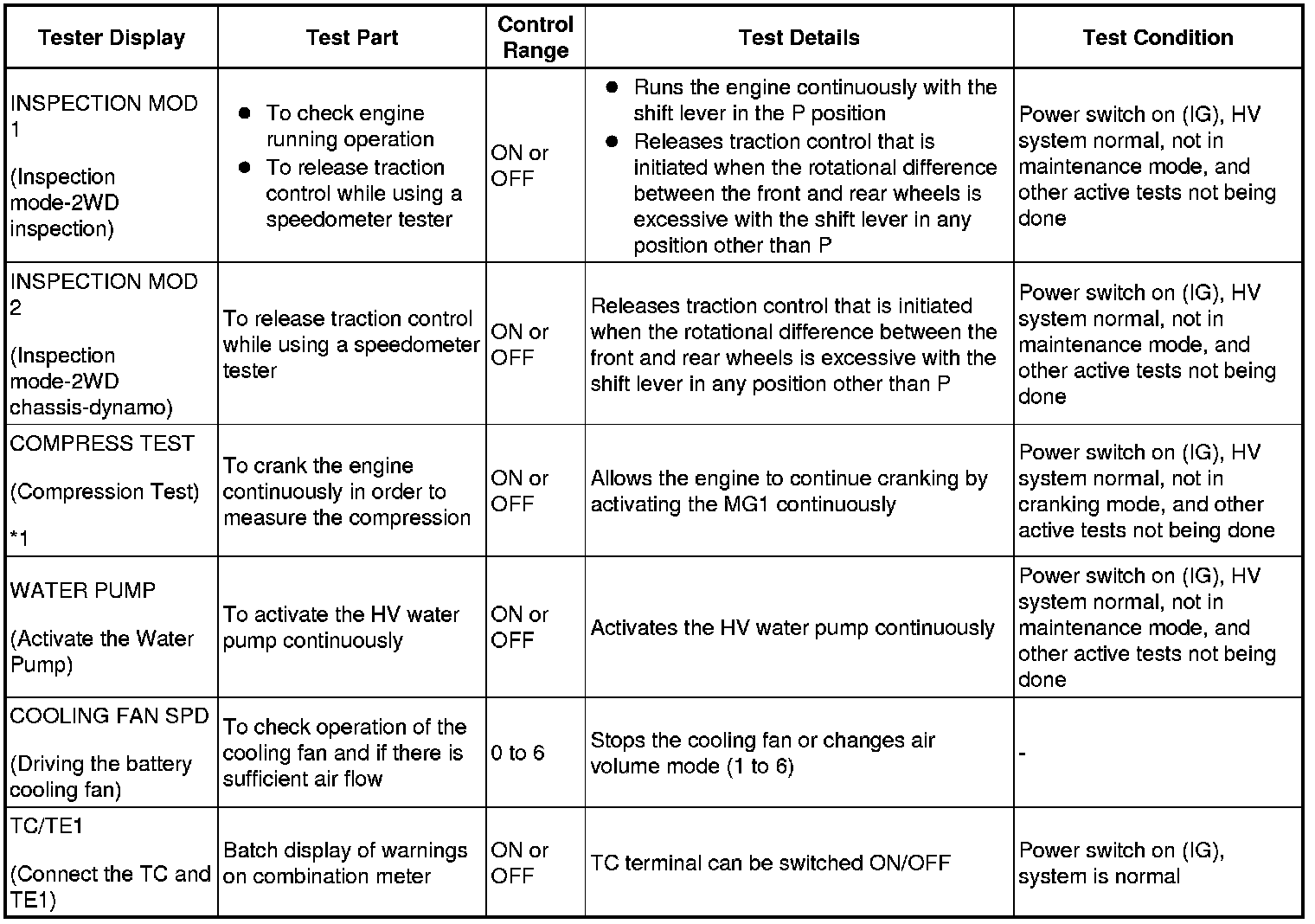 NOTICE: For items marked with *1 in the chart, the intelligent tester will display a communication error and the vehicle's READY light will turn off when the active test is completed. If the tester will be used on the vehicle again, turn the power switch off and then on (READY) again to restart the tester.