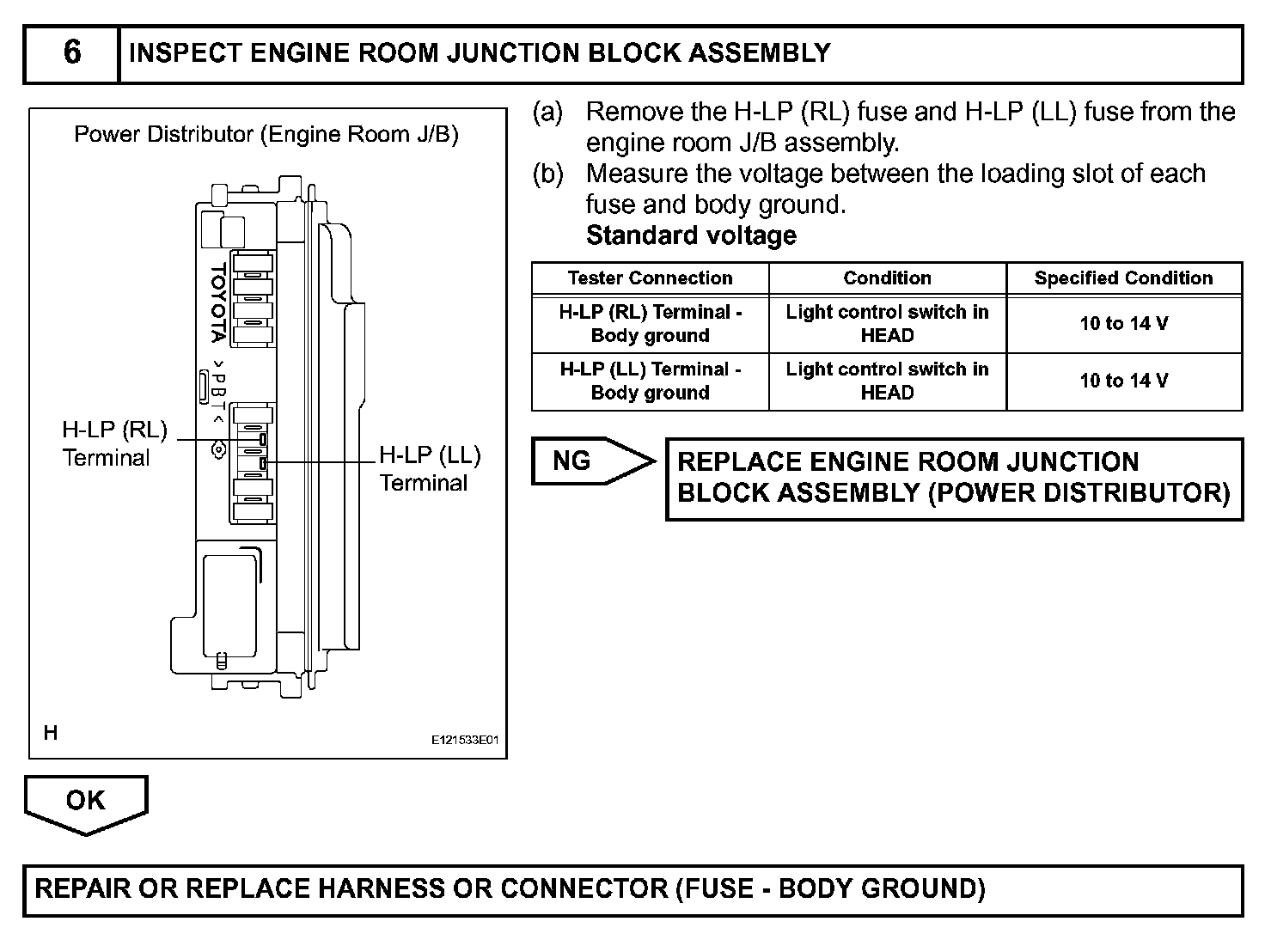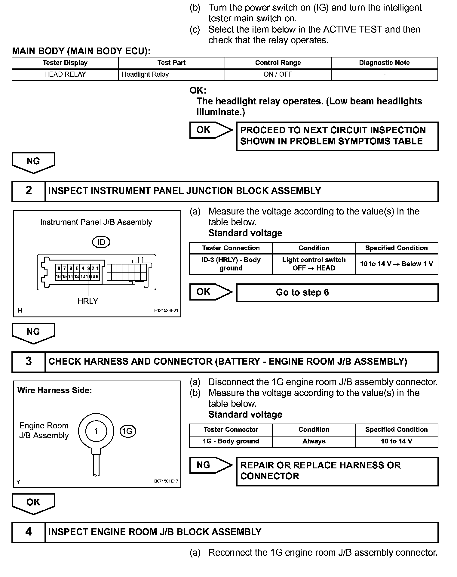 The main body ECU receives a light control switch HEAD signal from the headlight dimmer switch assembly, and turns the low beam headlights on. The headlight relay is installed in the power distributor (engine room J/B assembly).