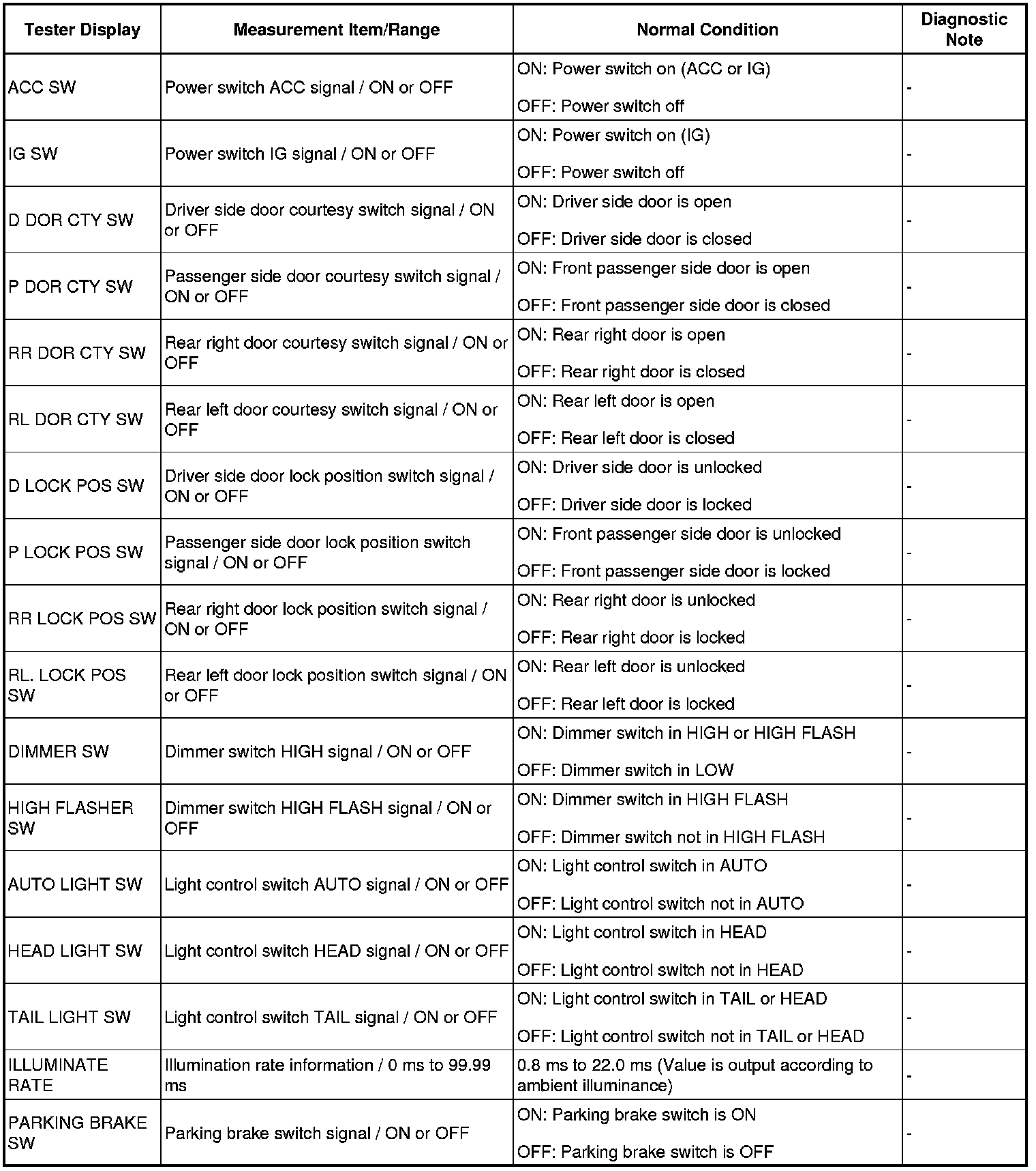 HINT: Using the intelligent tester DATA LIST allows switch, actuator and other item values to be read without removing any parts. Reading the DATA LIST early in troubleshooting is one way to save time.