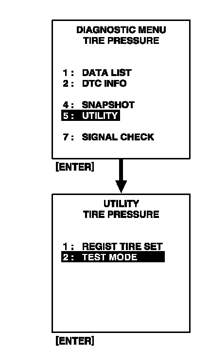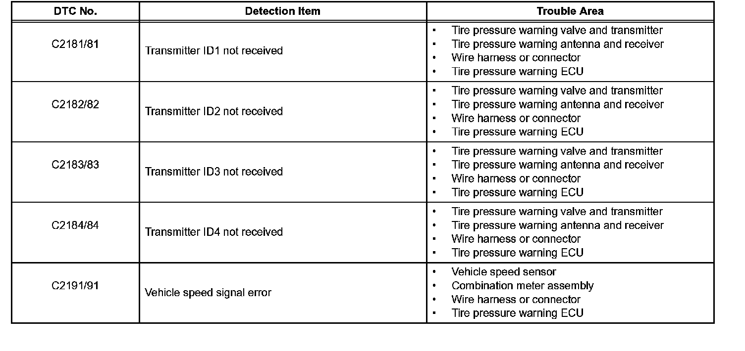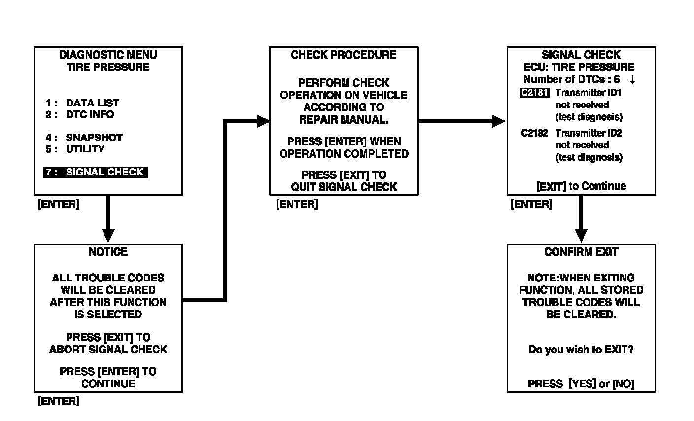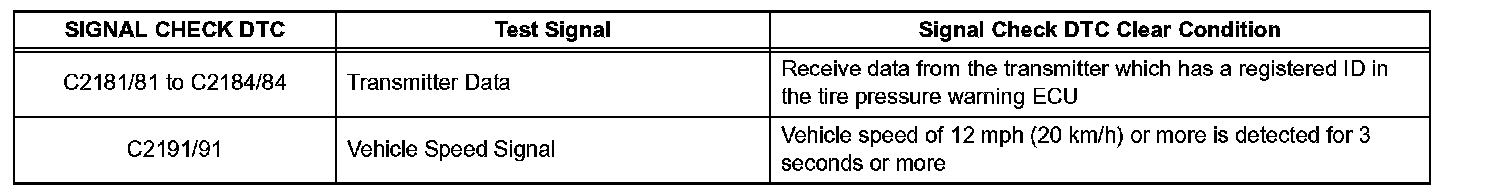 - When entering signal check mode, the tire pressure warning ECU sets all the signal check DTCs first. After completing signal check for each inspection item, the DTCs for systems that are determined to be normal by the tire pressure warning ECU will be erased.