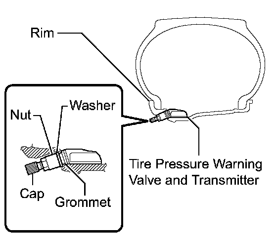 ^ Check that there is no visible deformation, damage, or other abnormalities on the tire pressure warning valve and transmitter.