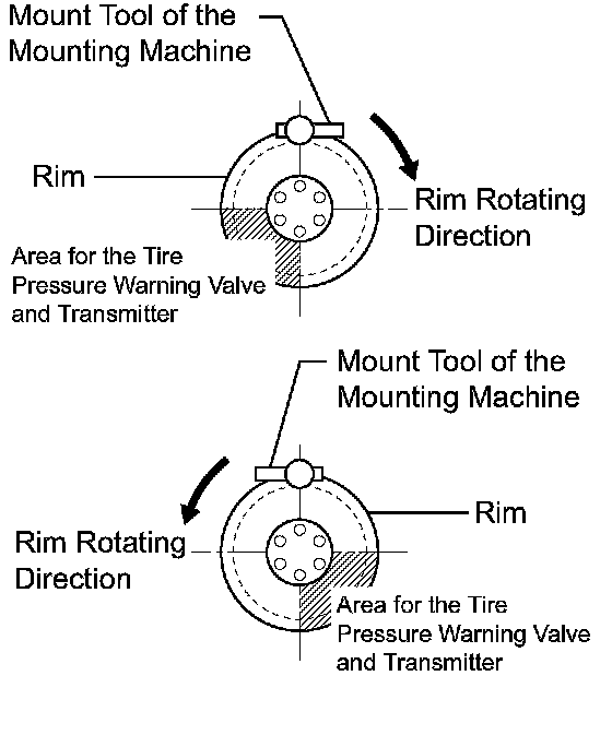 (c) Set the wheel disc to the mounting machine and install the lower tire bead. Position the main body of the tire pressure warning valve and transmitter in the shaded area shown in the illustration.