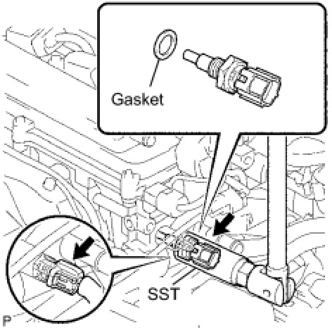 (b) Using SST, install the engine coolant temperature sensor.