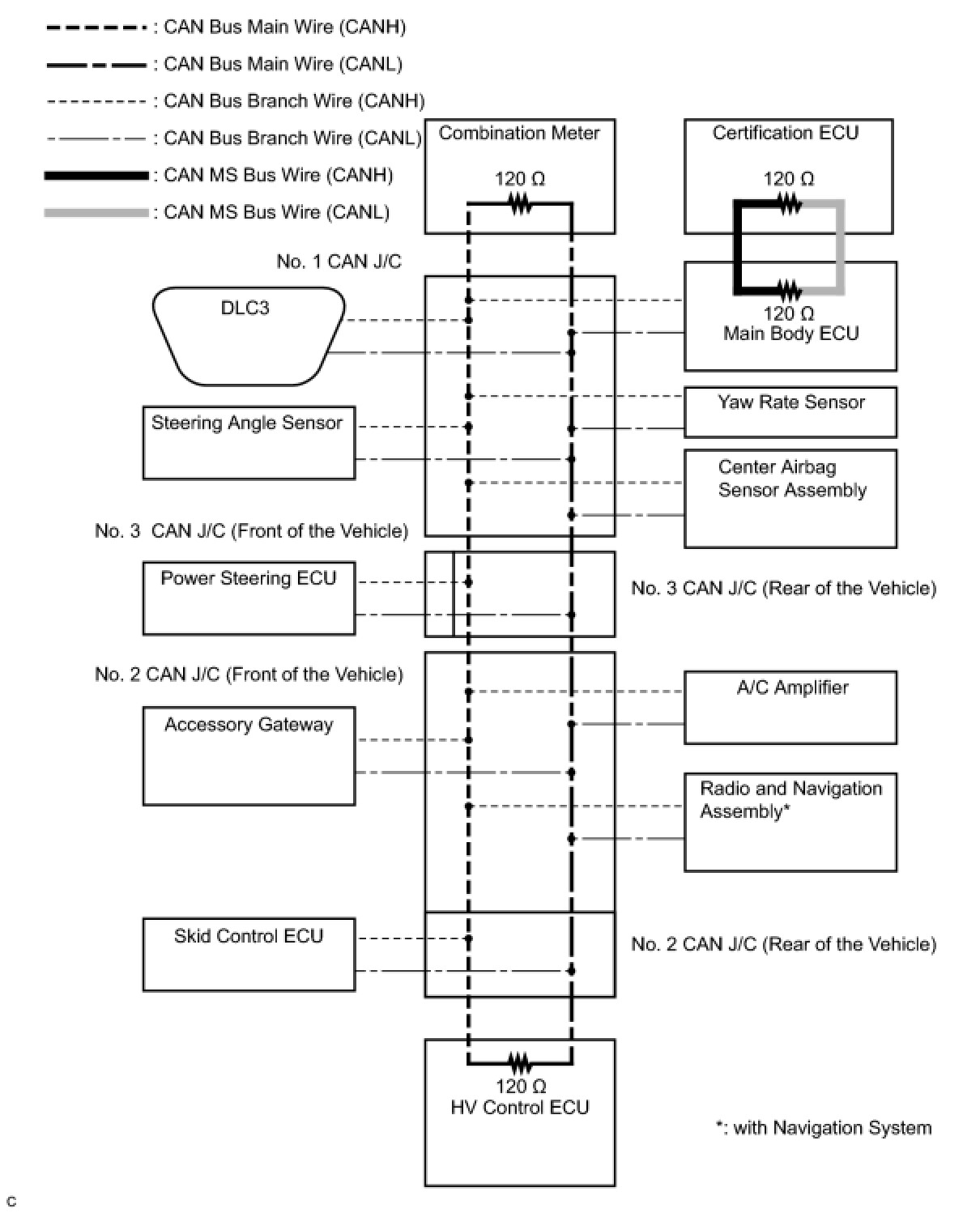 The MS-CAN bus is a medium-speed communication bus that is used for body electrical communication. The MS-CAN bus is referred to as the "CAN MS bus" and it operates at speeds of approximately 250 kbps. Terminating resistors for the MS-CAN bus are located in the main body ECU and the certification ECU. The resistance of the MS-CAN bus cannot be measured from the DLC3 connector.