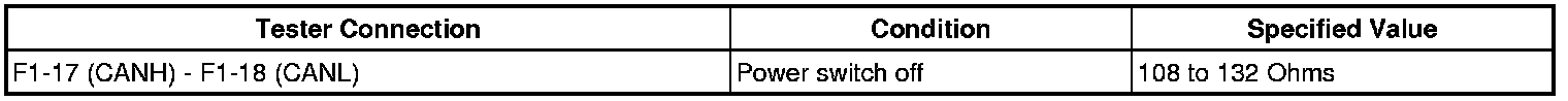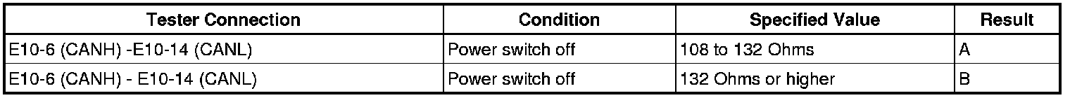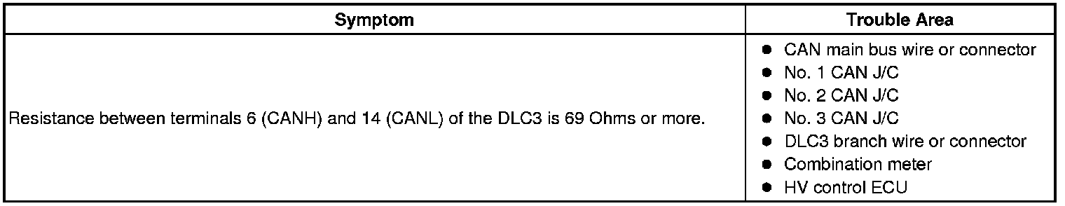 There may be an open circuit in the CAN main bus wire and/or the DLC3 branch wire when the resistance between terminals 6 (CANH) and 14 (CANL) of the DLC3 is 69 Ohms or more.