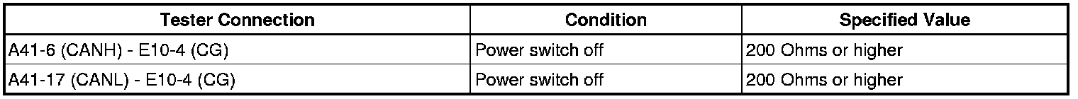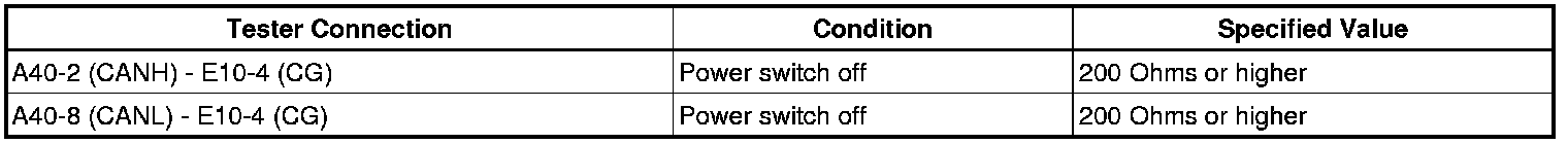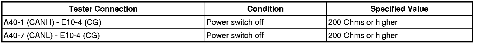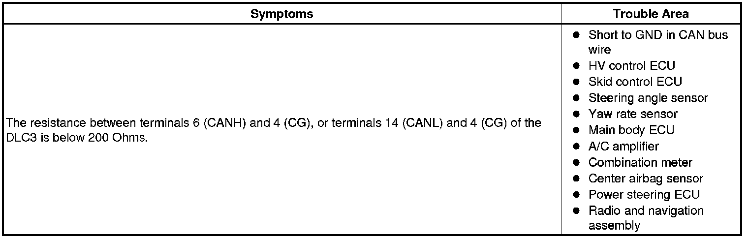 A short to GND is suspected in the CAN bus wire when the resistance between terminals 4 (CG) and 6 (CANH), or terminals 4 (CG) and 14 (CANL) of the DLC3 is below 200 Ohms.