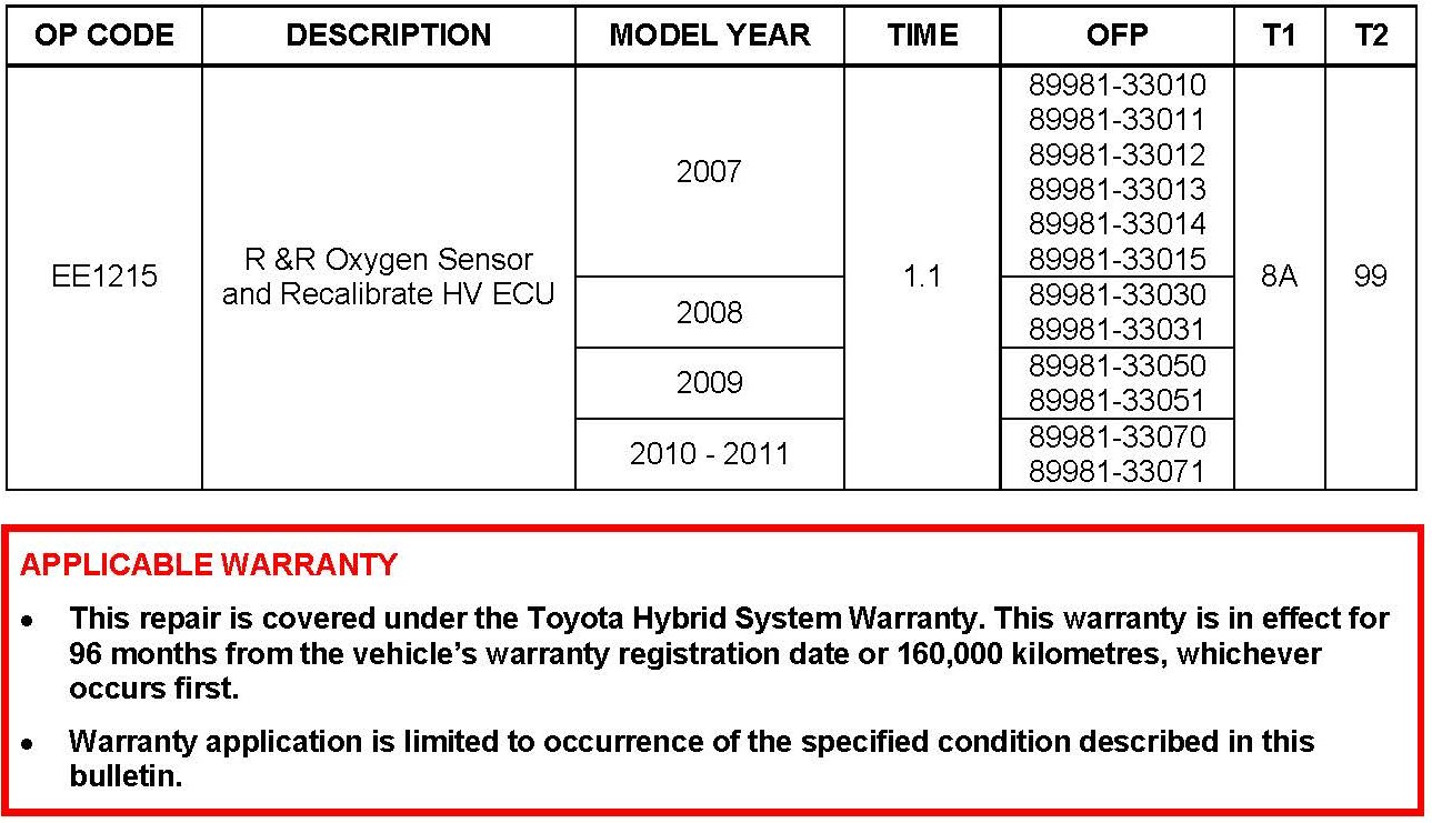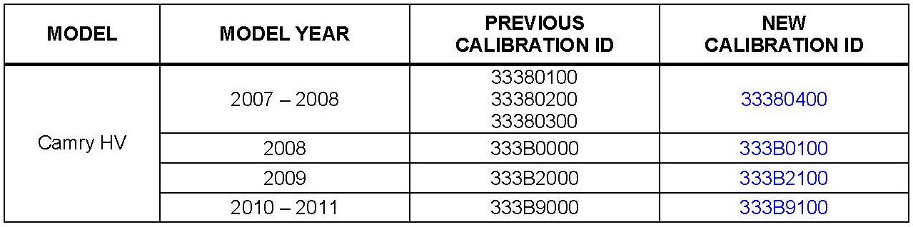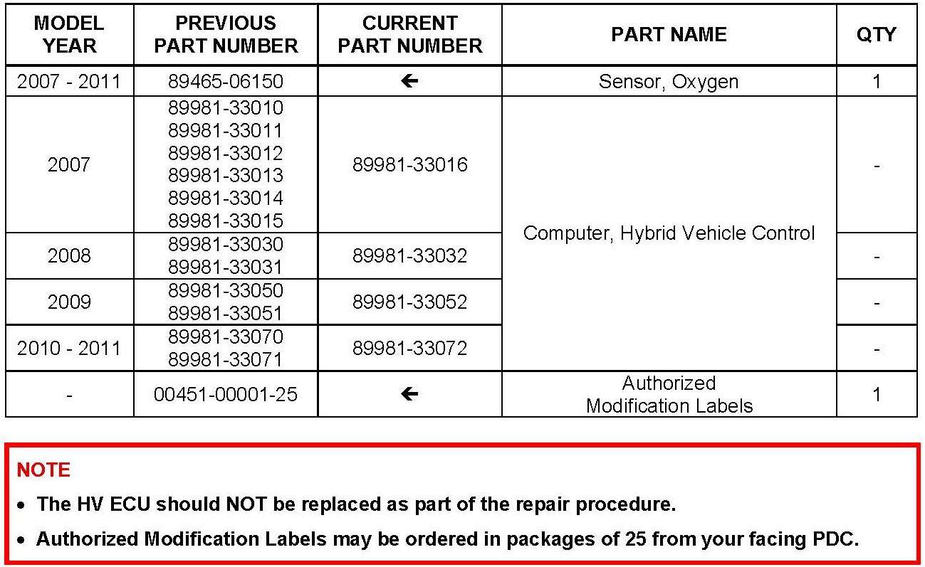 Some 2007 - 2011 model year Camry HV vehicles equipped with a 2AZ-FXE engine may exhibit a MIL "ON" condition with Diagnostic Trouble Code (DTC) P0136 Oxygen Sensor Circuit Malfunction (Bank 1 Sensor 2). The oxygen sensor and Hybrid Vehicle ECU (HV ECU) logic have been modified to reduce the possibility of this condition occurring. Use the following repair procedure to address this condition.