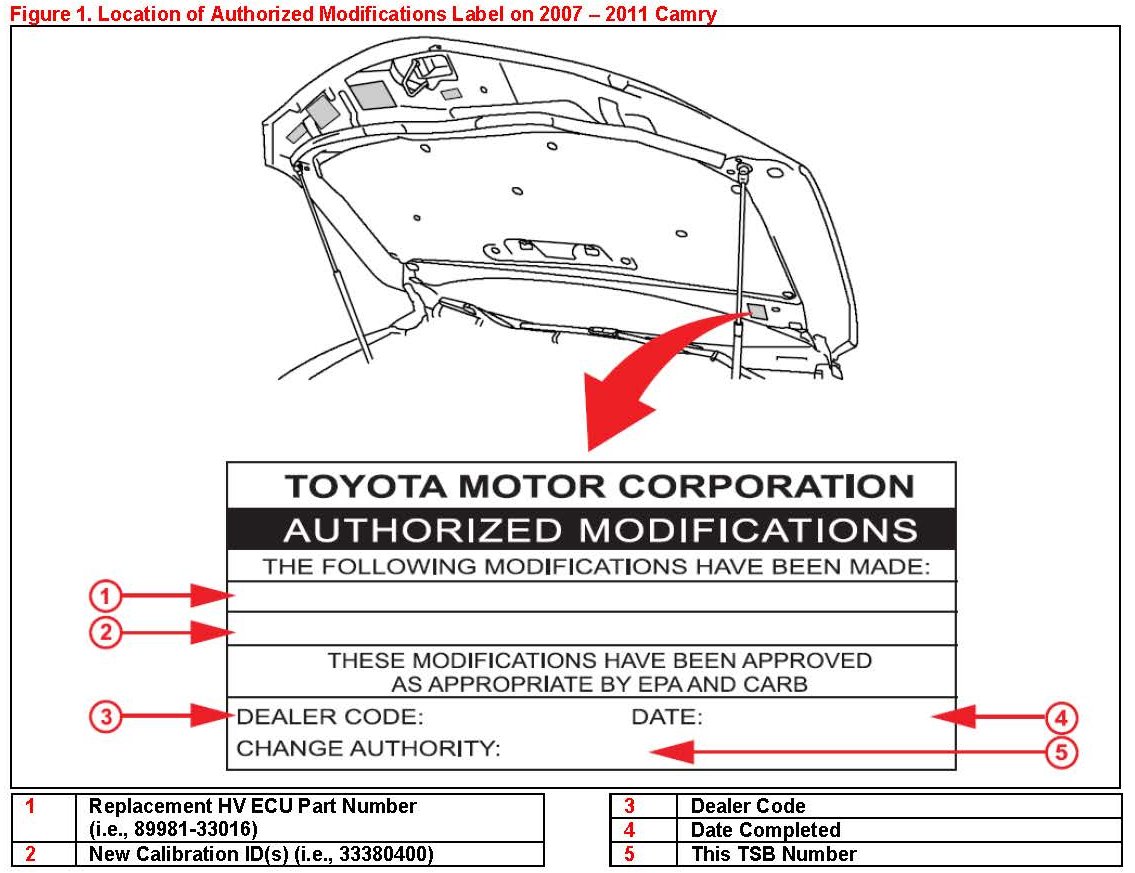 3. Check for the Authorized Modifications Label affixed to the vehicle in the location shown in Figure 1. Confirm if the HV ECU calibration has been updated. If the calibration ID listed is NOT the latest HV ECU calibration - go to step 4.