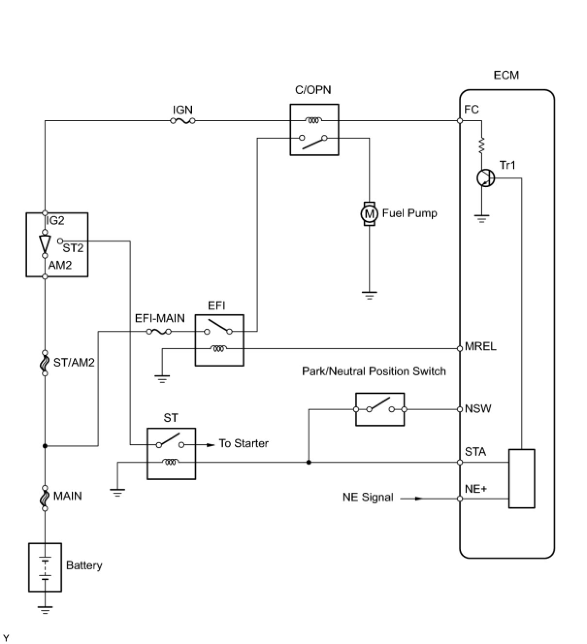 When the engine is cranked, the starter relay drive signal output from the STAR terminal of the ECM (included in hybrid vehicle control ECU) is input into the STA terminal of the ECM, and NE signal generated by the crankshaft position sensor is also input into the NE+ terminal. Thus, the ECM interprets that the engine is cranked, and turns the transistor Tr1 in the ECM internal circuit ON. The current flows to the C/OPN (Circuit Opening) relay by turning the Tr1 ON. Then, the fuel pump operates.