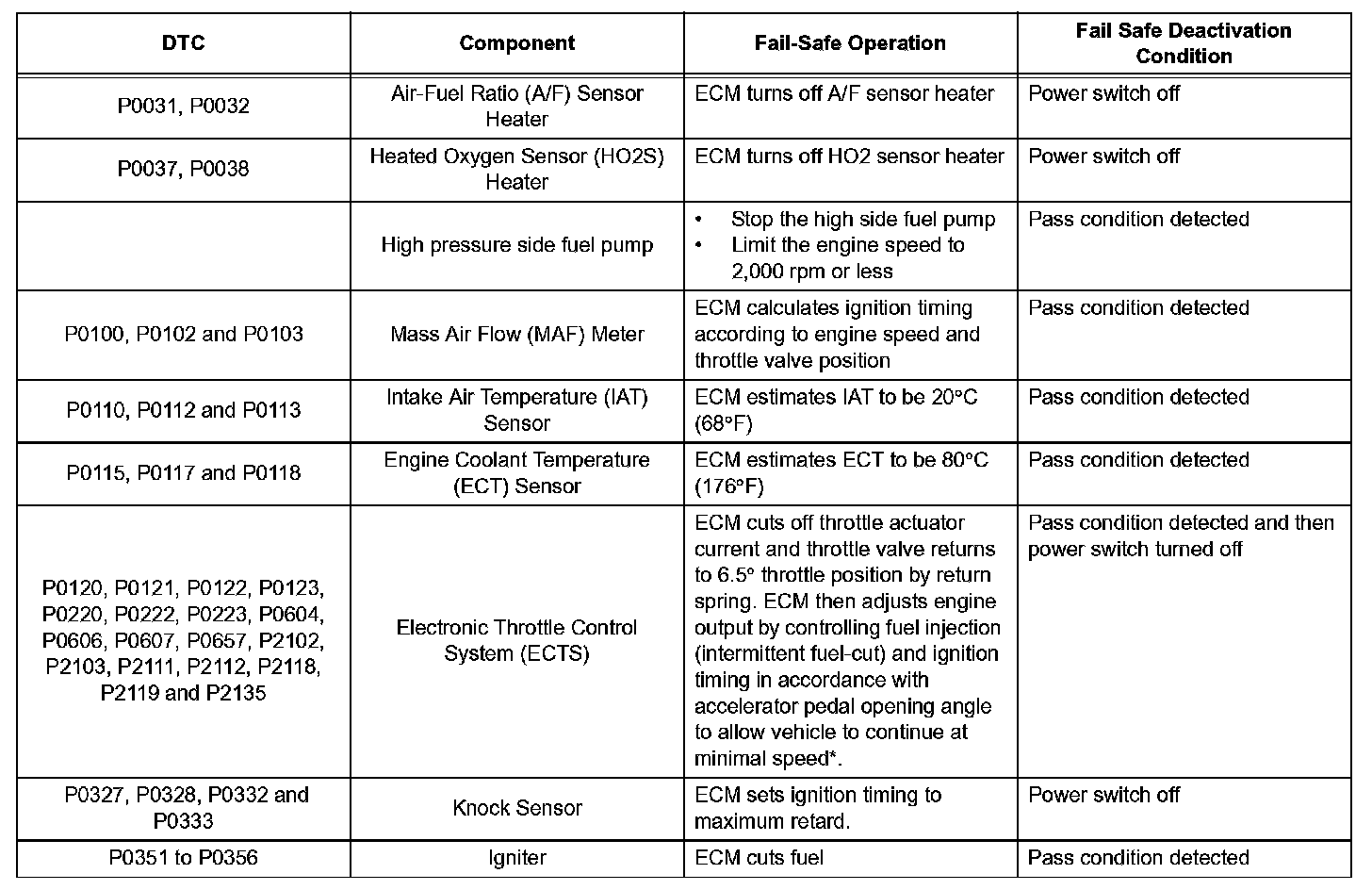FAIL-SAFE CHARTIf any of the following DTCs are set, the ECM (Included in Hybrid Vehicle Control ECU) enters fail-safe mode to allow the vehicle to be driven temporarily.