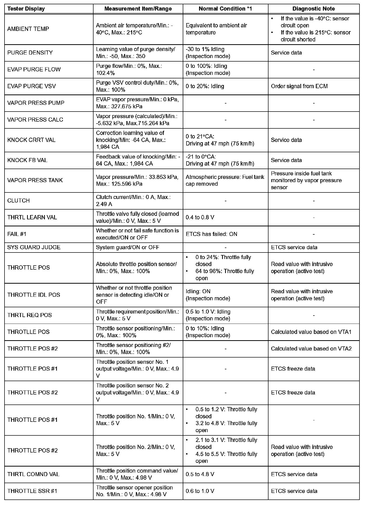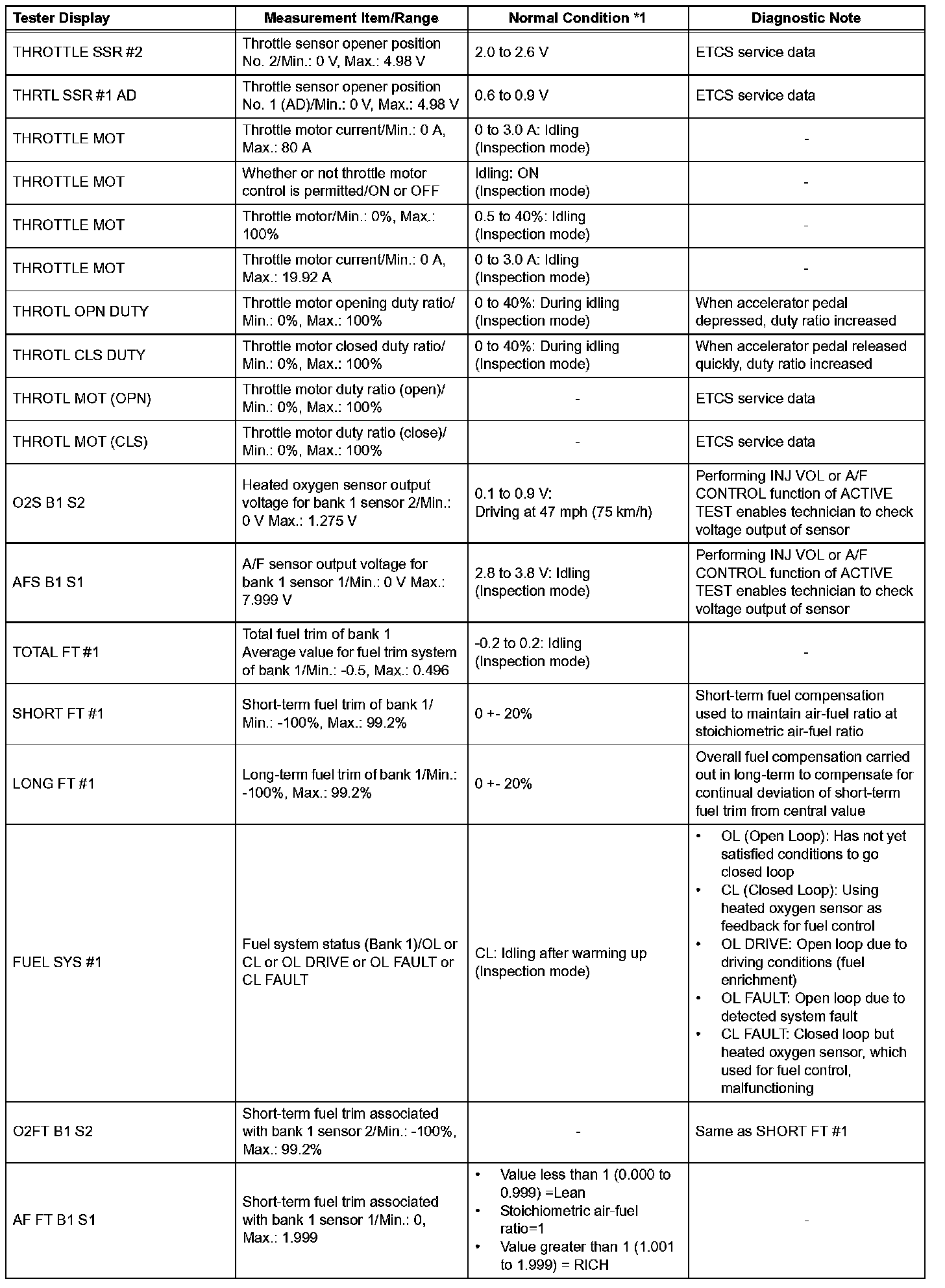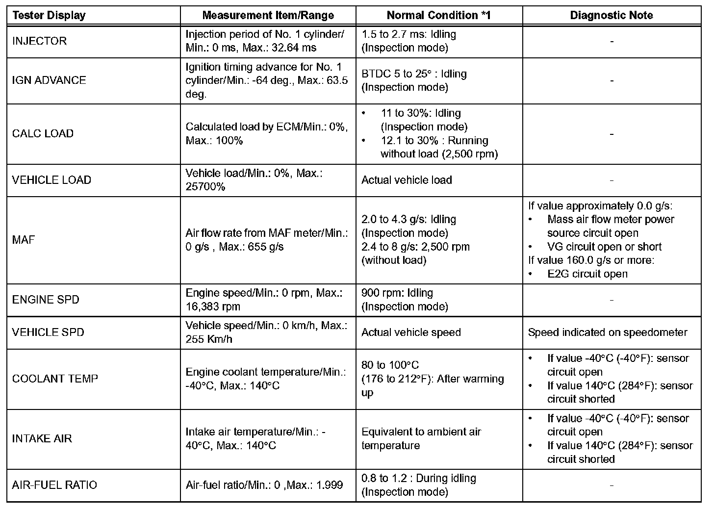 NOTE: In the table, the values listed under Normal Condition are for reference only. Do not depend solely on these values when determining whether or not a part is faulty.