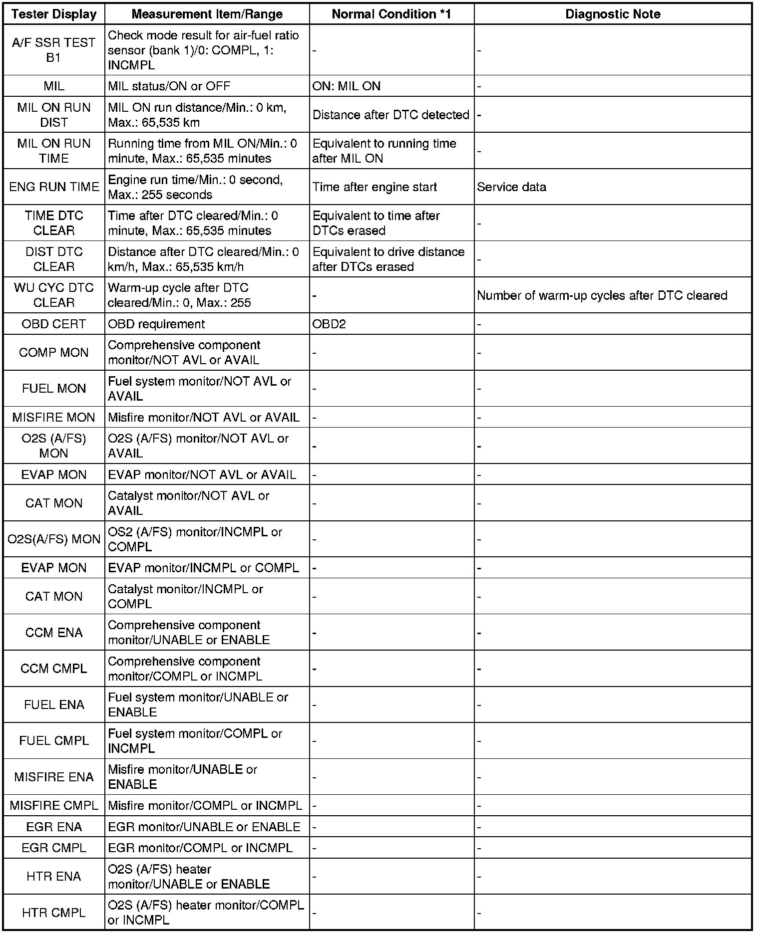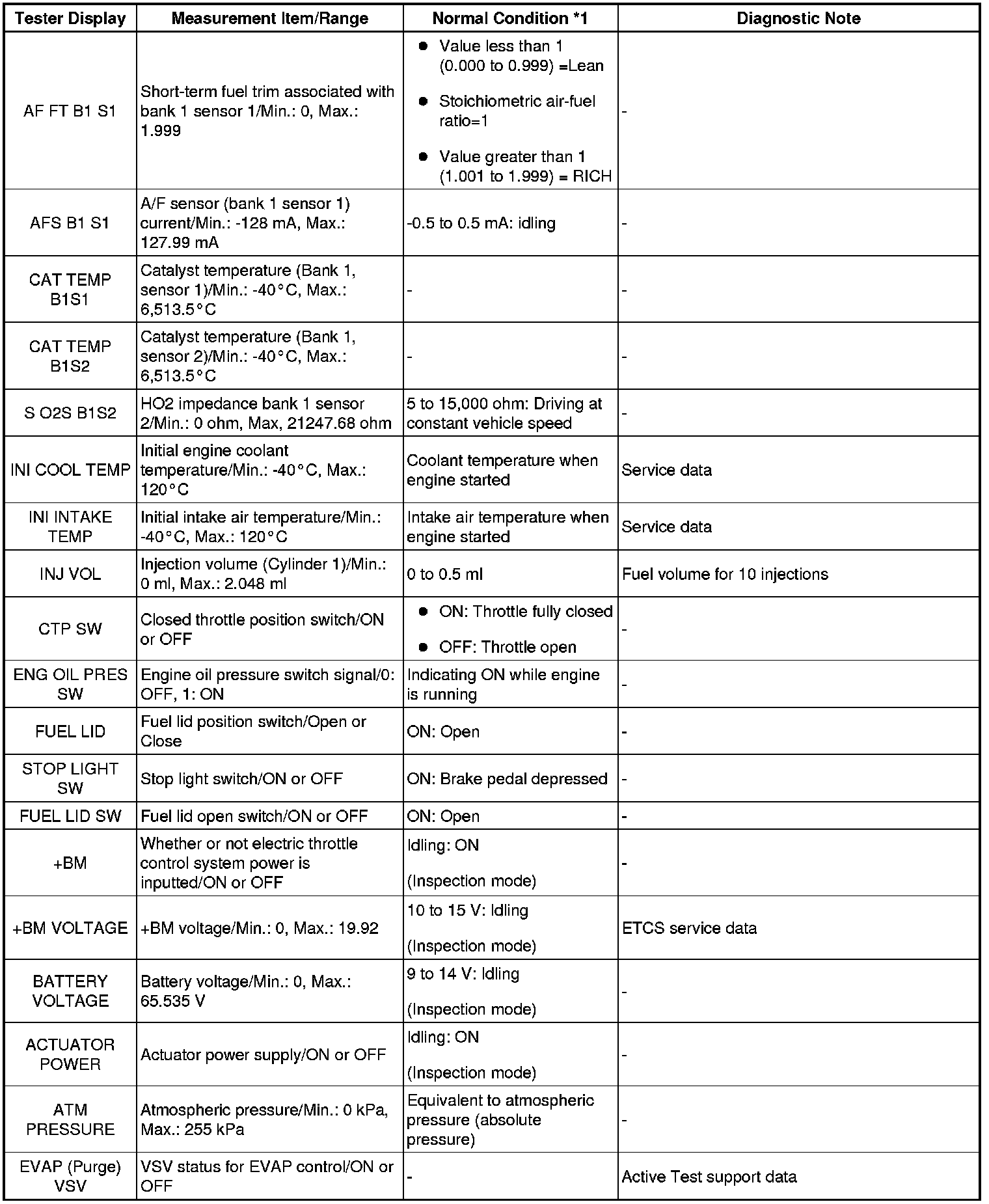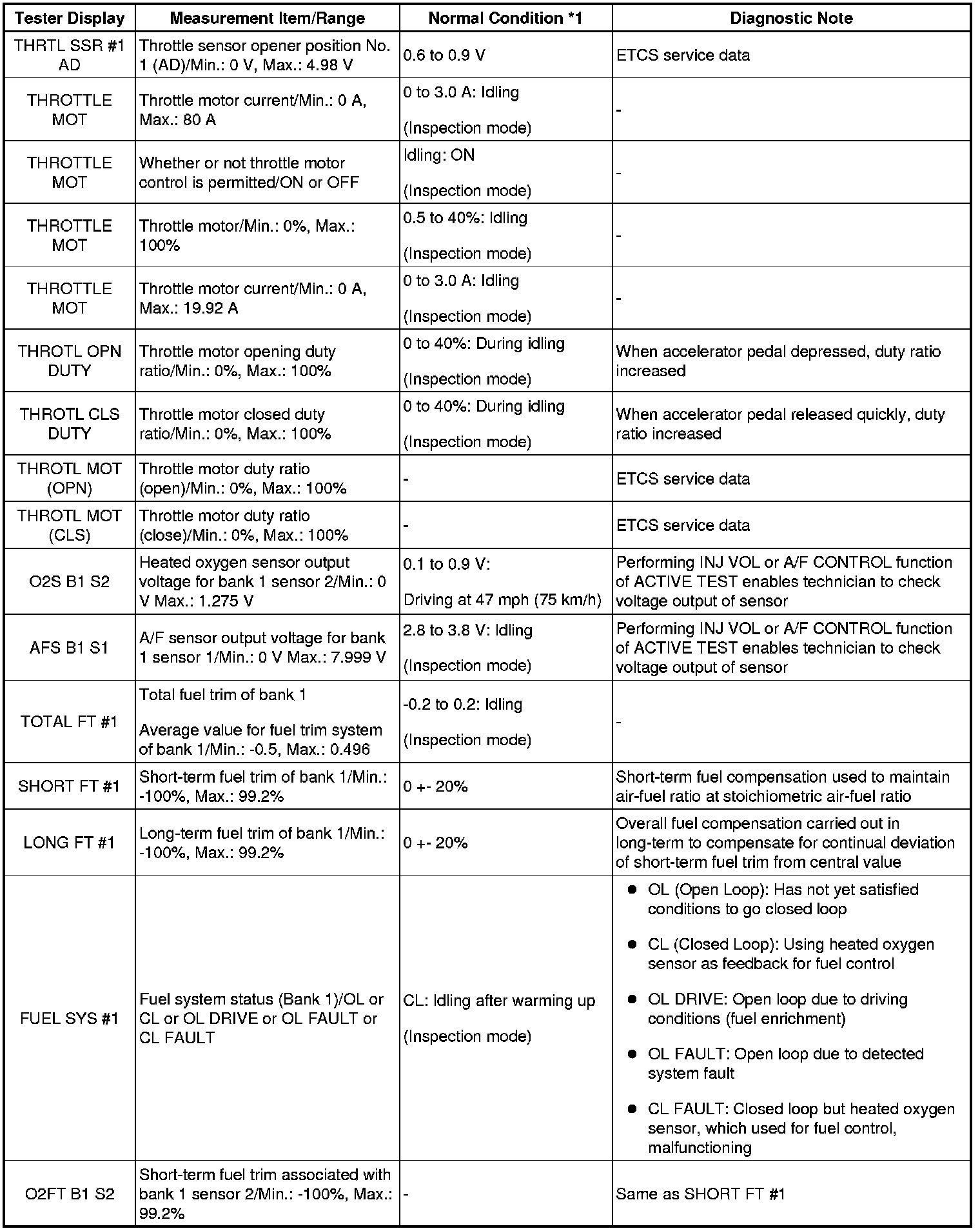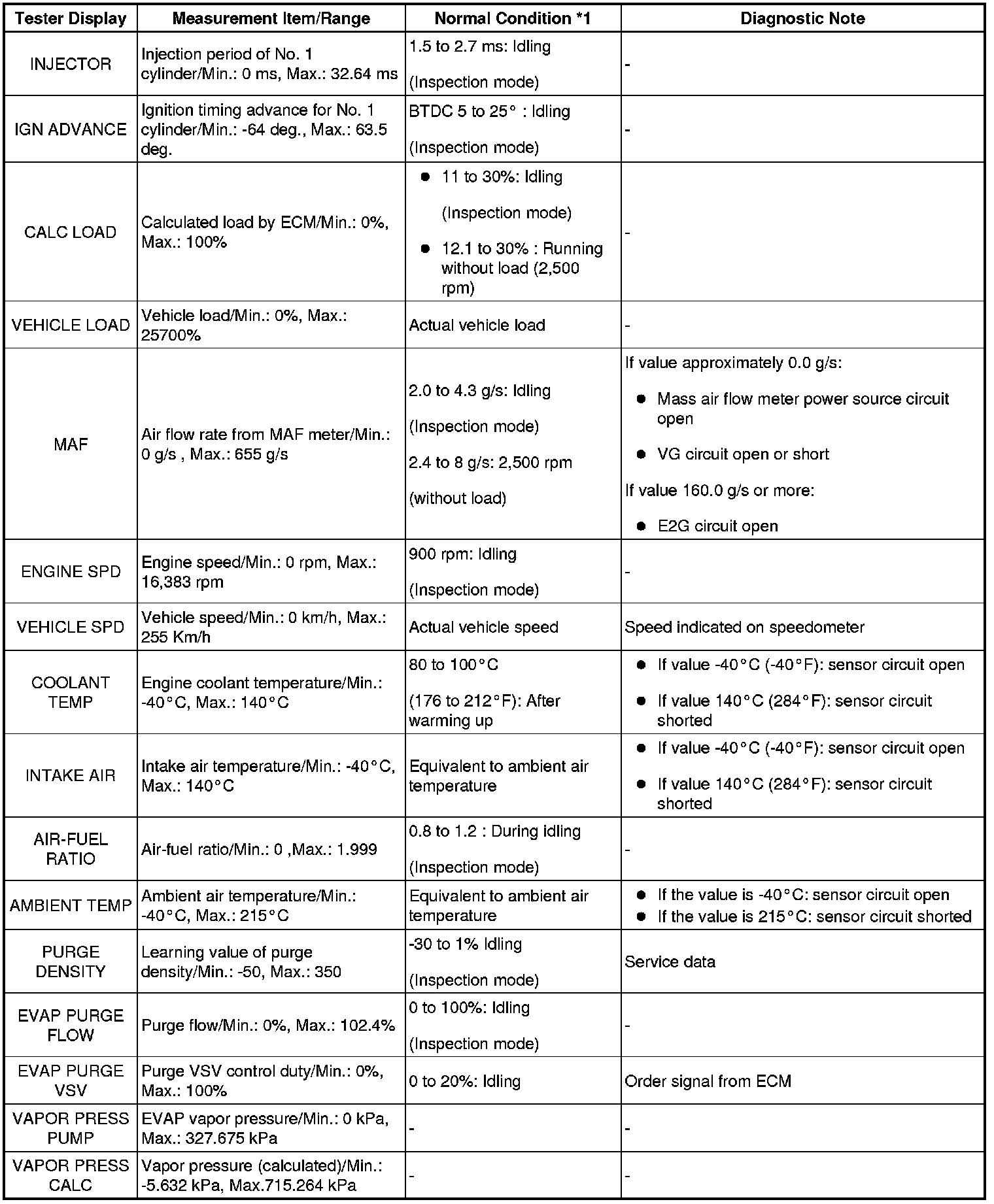 NOTICE: In the table below, the values listed under Normal Condition are for reference only. Do not depend solely on these values when determining whether or not a part is faulty.