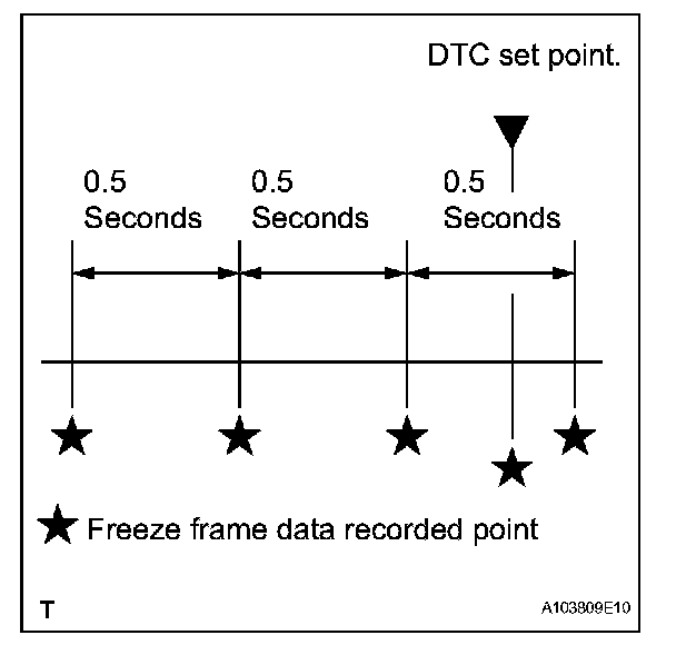 The ECM records engine conditions in the form of freeze frame data every 0.5 seconds. Using the intelligent tester, five separate sets of freeze frame data, including the data values at the time when the DTC was set, can be checked.