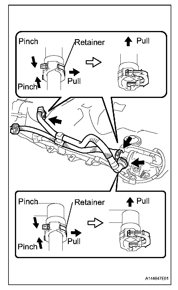1. Pinch the tab of the retainer to disengage the lock claws and pull it down as shown in the illustration.
