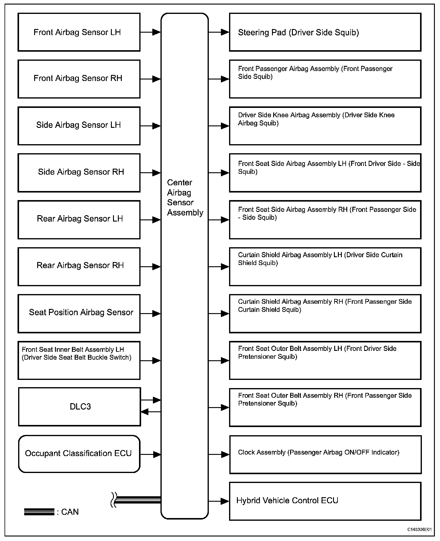 f. The center airbag sensor assembly sends the airbag deployment signal to the hybrid vehicle control ECU through CAN (Controller Area Network) to operate the fuel pump control.