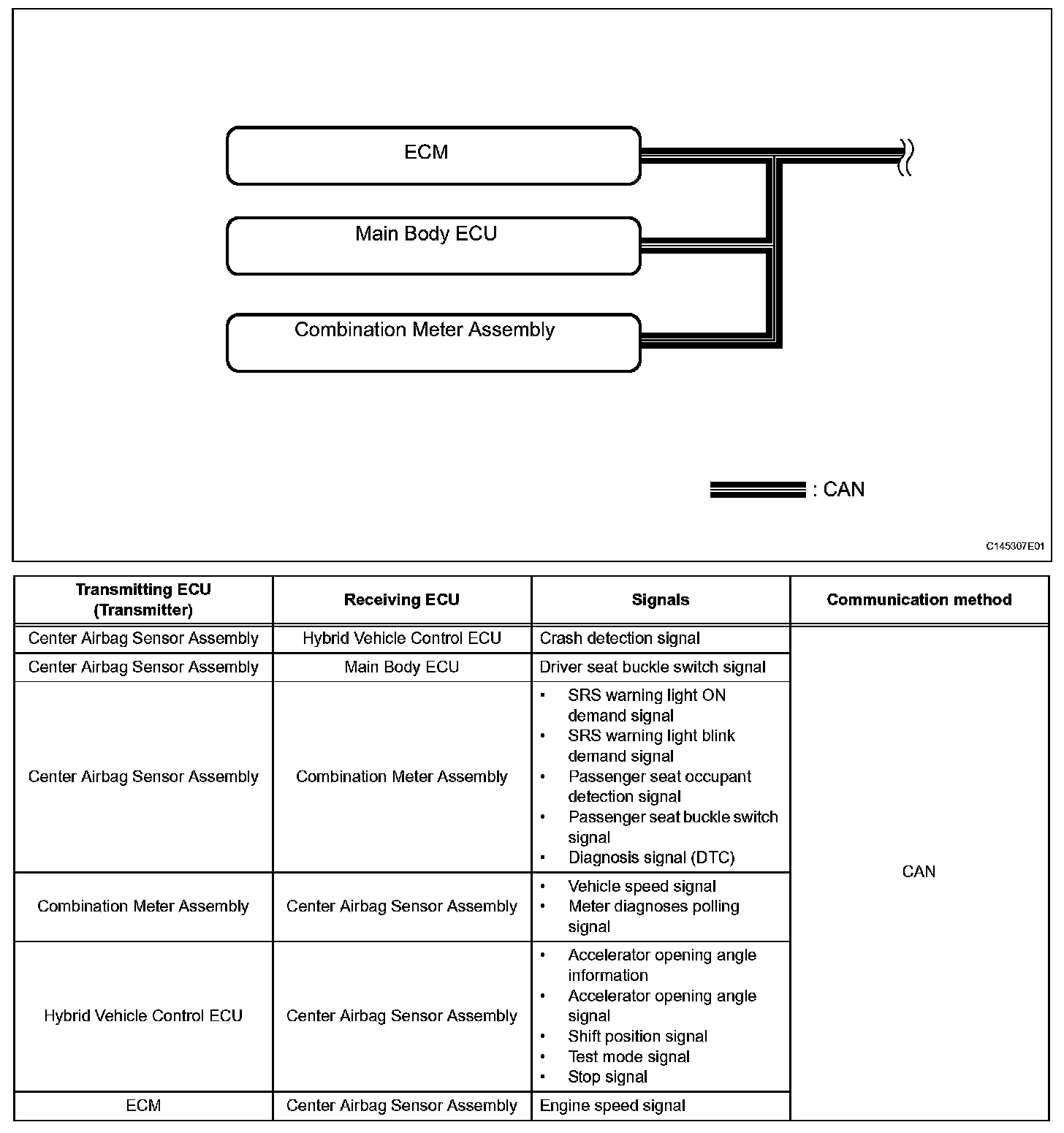 - The center airbag sensor assembly sends the airbag deployment signal to the ECM through CAN to operate the fuel pump control.