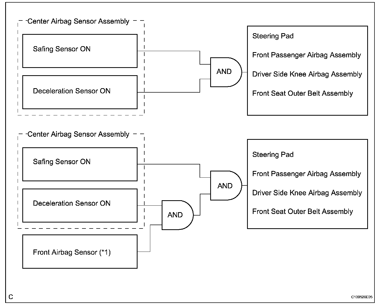 a. The center airbag sensor assembly determines whether ignition is necessary based on signals from the deceleration sensor and the front airbag sensor (*1). If the safing sensor turns on simultaneously, current flows to the squibs to deploy the SRS as shown in the illustration.